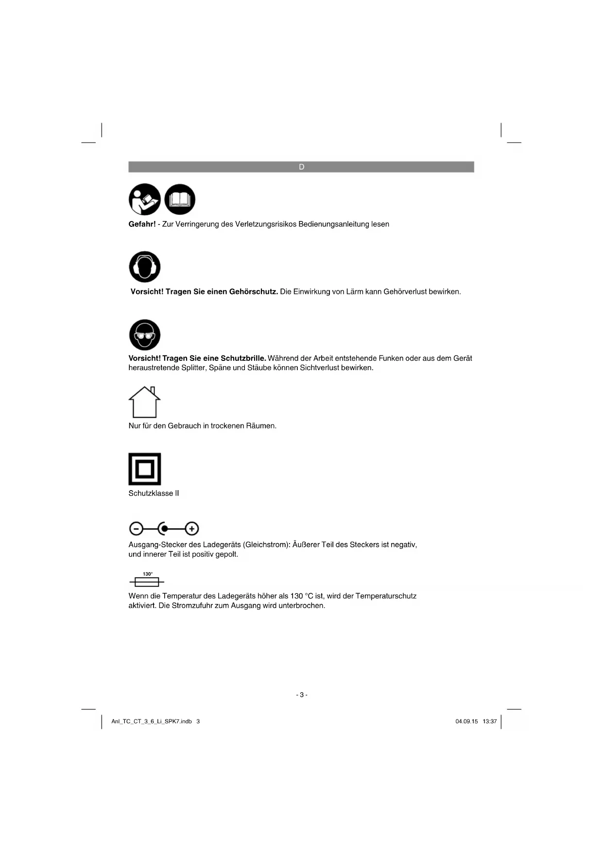 Gefahr! - Zur Verringerung des Verletzungsrisikos Bedienungsanleitung lesen Vorsicht! Tragen Sie einen Gehörschutz. Die Einwirkung von Lärm kann Gehörverlust bewirken. Vorsicht! Tragen Sie eine Schutzbrille. Während der Arbeit entstehende Funken oder aus dem Gerät heraustretende Splitter, Späne und Stäube können Sichtverlust bewirken. Nur für den Gebrauch in trockenen Räumen. Schutzklasse II Ausgang-Stecker des Ladegeräts (Gleichstrom): Äußerer Teil des Steckers ist negativ, und innerer Teil ist positiv gepolt. 130° Wenn die Temperatur des Ladegeräts höher als 130 °C ist, wird der Temperaturschutz aktiviert. Die Stromzufuhr zum Ausgang wird unterbrochen. Anl_TC_CT_3_6_Li_SPK7.indb 3Anl_TC_CT_3_6_Li_SPK7.indb 3 04.09.15 13:3704.09.15 13:37D
