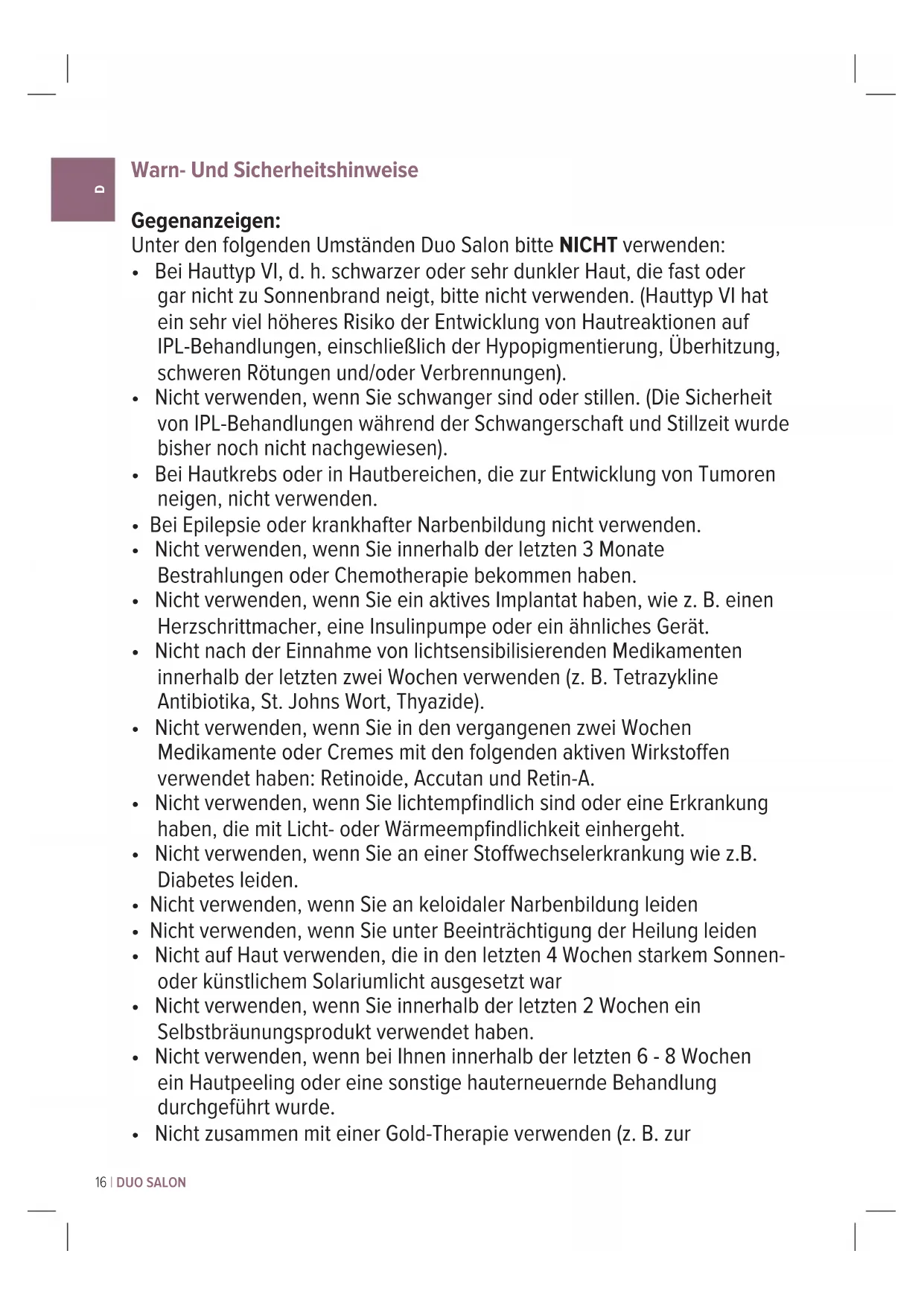 Warn- Und Sicherheitshinweise Gegenanzeigen: Unter den folgenden Umständen Duo Salon bitte NICHT verwenden: