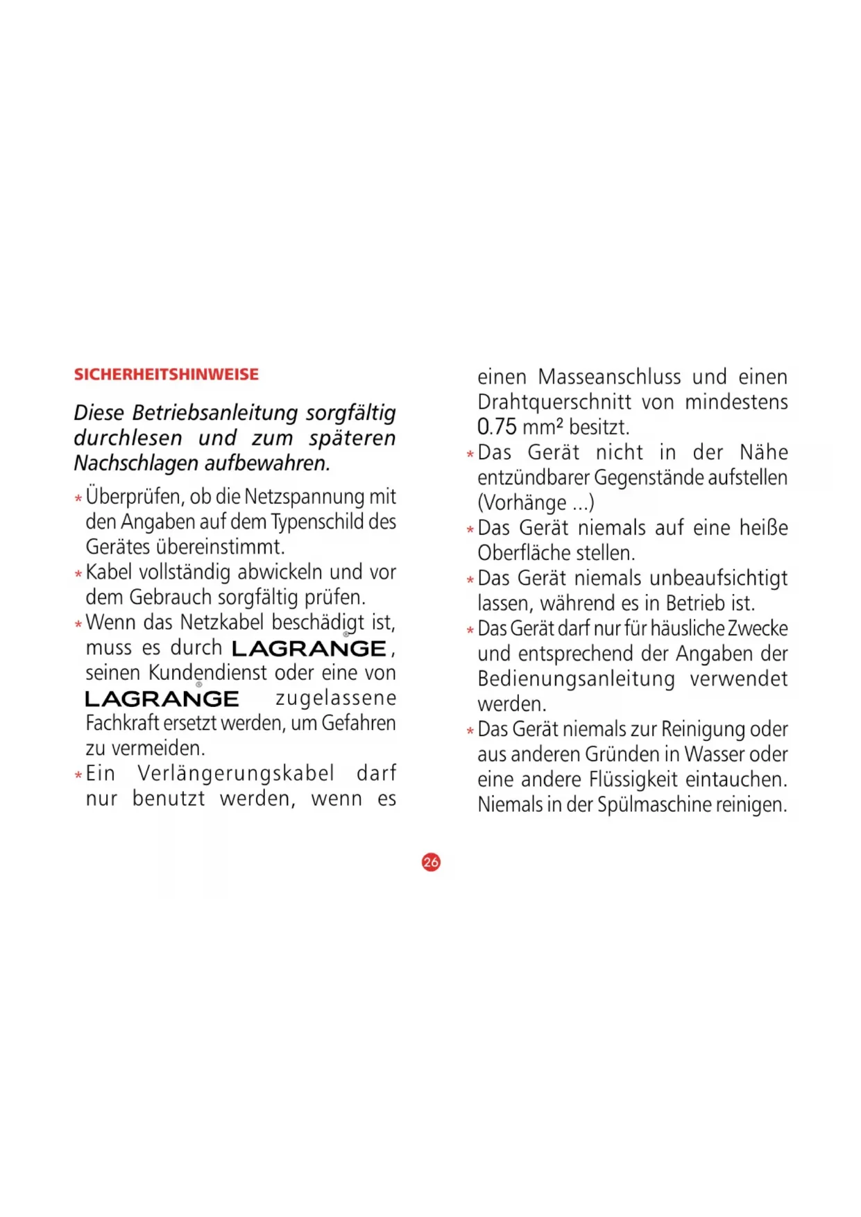 Minuten ziehen. Garen Sie die Fischstückchen auf dem Stein. Servieren Sie das Ganze mit Toastsbrot und frischer Salzbutter. 36GARANTIEBEDINGUNGEN Garantie auf -Geräte Wir garantieren Ihr Gerät für eine Dauer von 2 Jahren. Um von einem kostenlosen zusätzlichen Garantiejahr zu protieren, registrieren Sie sich bitte auf der -Website (www.lagrange.fr). Die Garantie umfasst Teile und Arbeitskosten und deckt Herstellungsfehler ab. Von der Garantie ausgeschlossen sind: Schäden, die durch unsachgemäßen Gebrauch oder Nichtbeachtung der Gebrauchsanweisung entstanden sind, sowie Bruch durch Herunterfallen. DIESE GARANTIE GILT NUR FÜR DEN HÄUSLICHEN GEBRAUCH, NICHT FÜR DEN PROFESSIONELLEN ODER SEMIPROFESSIONELLEN GEBRAUCH. Die vom Verkäufer geschuldete gesetzliche Gewährleistung schließt die vom Hersteller geschuldete gesetzliche Gewährleistung für Mängel oder versteckte Fehler gemäß Artikel 1641 bis 1649 des frz. Zivilgesetzbuchs nicht aus. Bei einem Fehler oder einer Störung wenden Sie sich bitte an Ihren Fachhändler. Im Falle eines technischen Defekts innerhalb von 8 Tagen nach dem Kauf werden die Geräte umgetauscht. Nach Ablauf dieses Zeitraums werden sie durch den -Kundendienst repariert. Um diese Garantie in Anspruch nehmen zu können, muss der Benutzer zwingend eine Kopie der Rechnung vorlegen, auf der das Kaufdatum des Geräts vermerkt ist. Dauer der Verfügbarkeit von Ersatzteilen Gemäß Artikel L 111-2 des französischen Verbraucherschutzgesetzes beträgt die Verfügbarkeit von Ersatzteilen, die wir für ein reparaturfähiges Produkt bereitstellen, 5 Jahre ab dem Herstellungsdatum. Diese Verfügbarkeit ist jedoch nur in dem Land gewährleistet, in dem das Produkt gekauft wurde. Versandkosten für Rücksendungen Nach Ablauf des ersten Jahres der Händlergewährleistung müssen Sie nur die Kosten für den Rückversand an das Werk tragen, die Rücksendung erfolgt dann schnellstmöglich auf unsere Kosten. Wenn Sie weitere Fragen zu unseren Produkten haben, können Sie uns unter folgender Adresse kontaktieren: Service consommateurs 17, chemin de la Plaine ZA Les Plattes CS30228