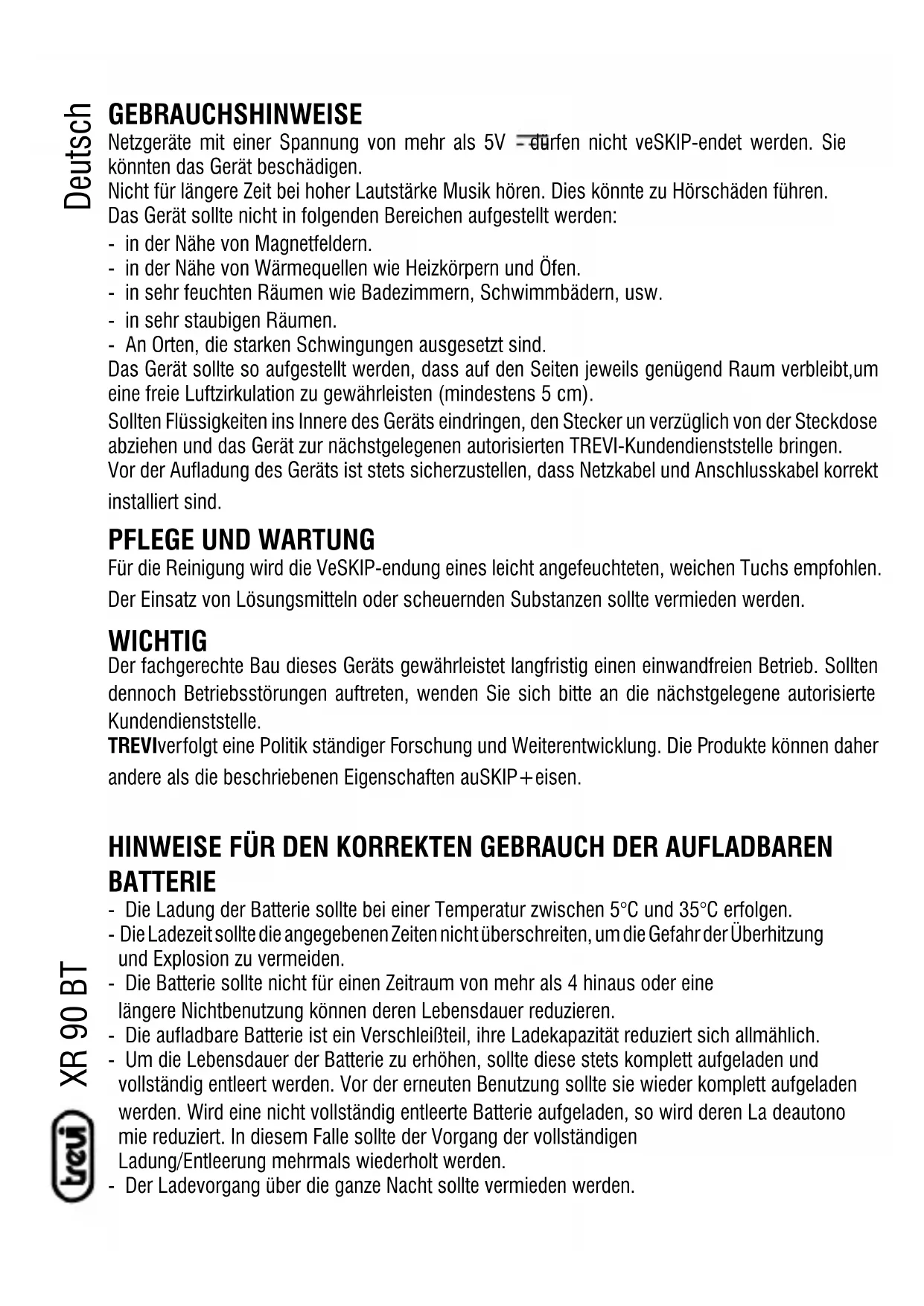 Für die Reinigung wird die VeSKIP-endung eines leicht angefeuchteten, weichen Tuchs empfohlen. Der Einsatz von Lösungsmitteln oder scheuernden Substanzen sollte vermieden werden. WICHTIG Der fachgerechte Bau dieses Geräts gewährleistet langfristig einen einwandfreien Betrieb. Sollten dennoch Betriebsstörungen auftreten, wenden Sie sich bitte an die nächstgelegene autorisierte Kundendienststelle. TREVIverfolgt eine Politik ständiger Forschung und Weiterentwicklung. Die Produkte können daher andere als die beschriebenen Eigenschaften auSKIP+eisen. HINWEISE FÜR DEN KORREKTEN GEBRAUCH DER AUFLADBAREN BATTERIE - Die Ladung der Batterie sollte bei einer Temperatur zwischen 5°C und 35°C erfolgen. - Die Ladezeit sollte die angegebenen Zeiten nicht überschreiten, um die Gefahr der Überhitzung und Explosion zu vermeiden. - Die Batterie sollte nicht für einen Zeitraum von mehr als 4 hinaus oder eine längere Nichtbenutzung können deren Lebensdauer reduzieren. - Die aufladbare Batterie ist ein Verschleißteil, ihre Ladekapazität reduziert sich allmählich. - Um die Lebensdauer der Batterie zu erhöhen, sollte diese stets komplett aufgeladen und vollständig entleert werden. Vor der erneuten Benutzung sollte sie wieder komplett aufgeladen werden. Wird eine nicht vollständig entleerte Batterie aufgeladen, so wird deren La deautono mie reduziert. In diesem Falle sollte der Vorgang der vollständigen Ladung/Entleerung mehrmals wiederholt werden. - Der Ladevorgang über die ganze Nacht sollte vermieden werden.XR 90 BT Deutsch