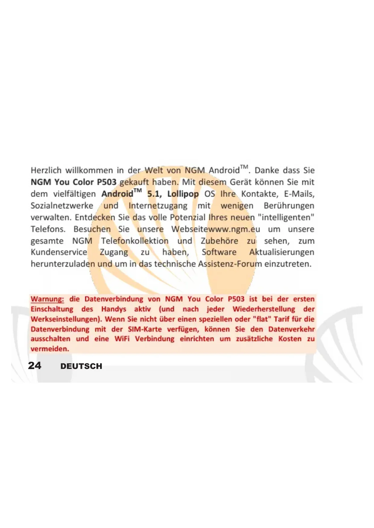 Herzlich willkommen in der Welt von NGM Android™. Danke dass Sie NGM You Color P503 gekauft haben. Mit thisem Gerät konnen Sie mit dem vielfälligen Android™ 5.1, Lollipop OS ihre Kontakte, E-Mails, Sozialnetzwerke und Internetzugang mit wichtigen Berührungen verhalten. Entdecken Sie das volle Potenzial Ihres neuen "intelligenten" Telefons. Besuchen Sie unsere Webseitewww.ngm.eu um unsere gesamte NGM Telefoncollektion und Zubehore zu sehen, zum Kundenservice Zugang zu haben, Software Aktualisierungen herunterzuladen und um in das technische Assistenz-Forum einzutreten.