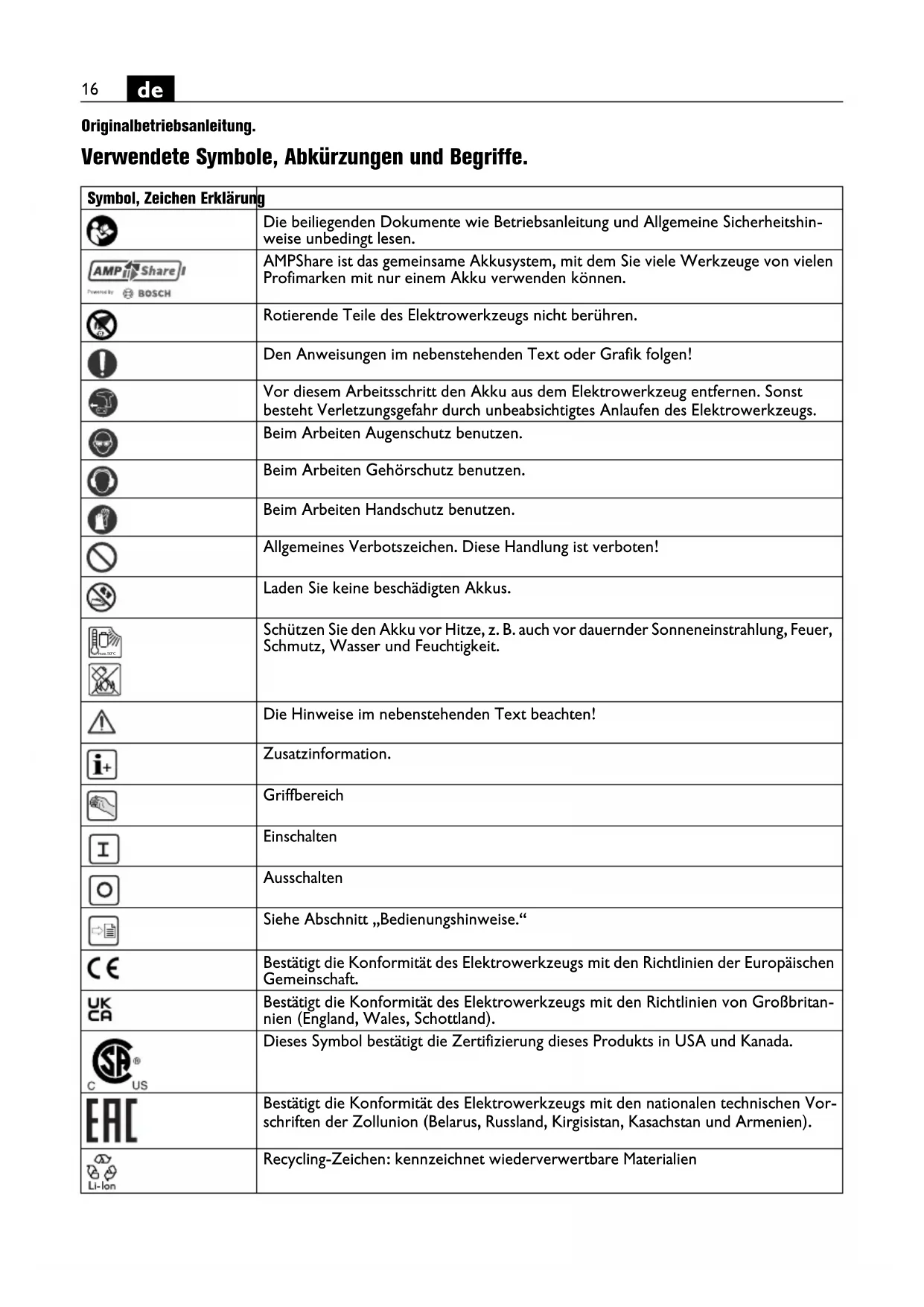 | CE | Bestätigt die Konformität des Elektrowerkzeugs mit den Richtlinien der Europäischen Gemeinschaft. |