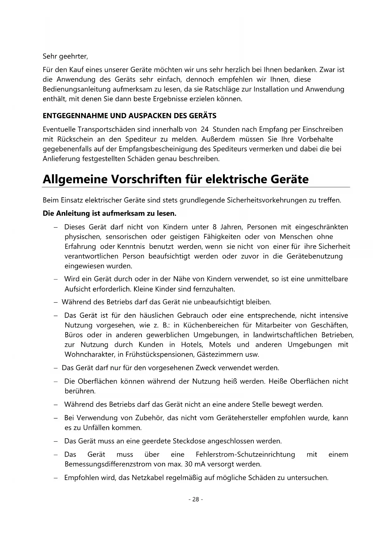 - Dieses Gerätarf nicht von Kindern unter 8 Jahren, Personen mit eingeschränkten physischen, sensorischen oder geistigen Fähigkeiten oder von Menschen ohne Erfahrung oder Kenntnis benutzt werden, wenn sie nicht von einer für ihre Sicherheit verantwortlichen Person beaufsichtigt werden oder zuvor in die Gerätebenutzung eingewiesen wurden.