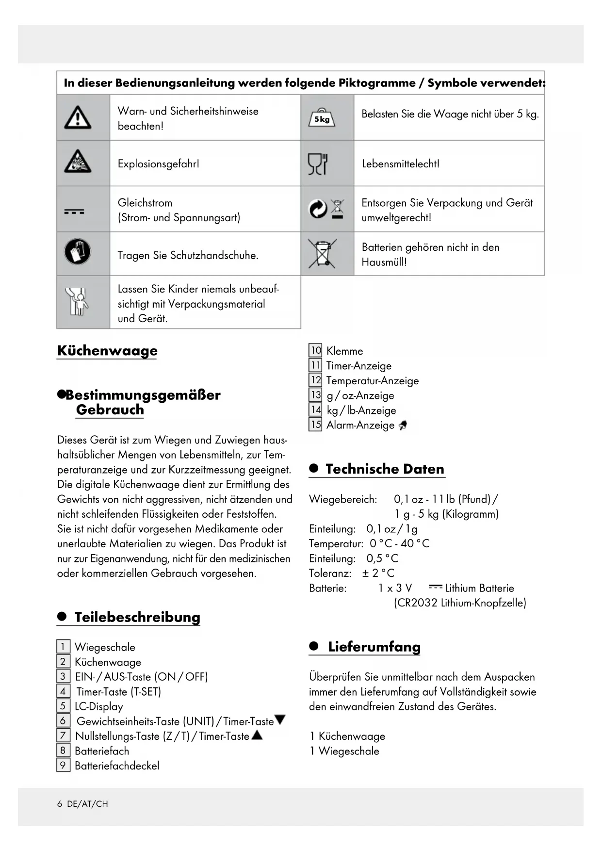 Lieferumfang Überprüfen Sie unmittelbar nach dem Auspacken immer den Lieferumfang auf Vollständigkeit sowie den einwandfreien Zustand des Gerätes. 1 Küchenwaage 1 Wiegeschale In dieser Bedienungsanleitung werden folgende Piktogramme / Symbole verwendet: Warn- und Sicherheitshinweise beachten! 5 kg Belasten Sie die Waage nicht über 5 kg. Explosionsgefahr! Lebensmittelecht! Gleichstrom (Strom- und Spannungsart) Entsorgen Sie Verpackung und Gerät umweltgerecht! Tragen Sie Schutzhandschuhe. Batterien gehören nicht in den Hausmüll! Lassen Sie Kinder niemals unbeauf- sichtigt mit Verpackungsmaterial und Gerät.7 DE/AT/CH 1 Lithium Batterie 1 Bedienungsanleitung