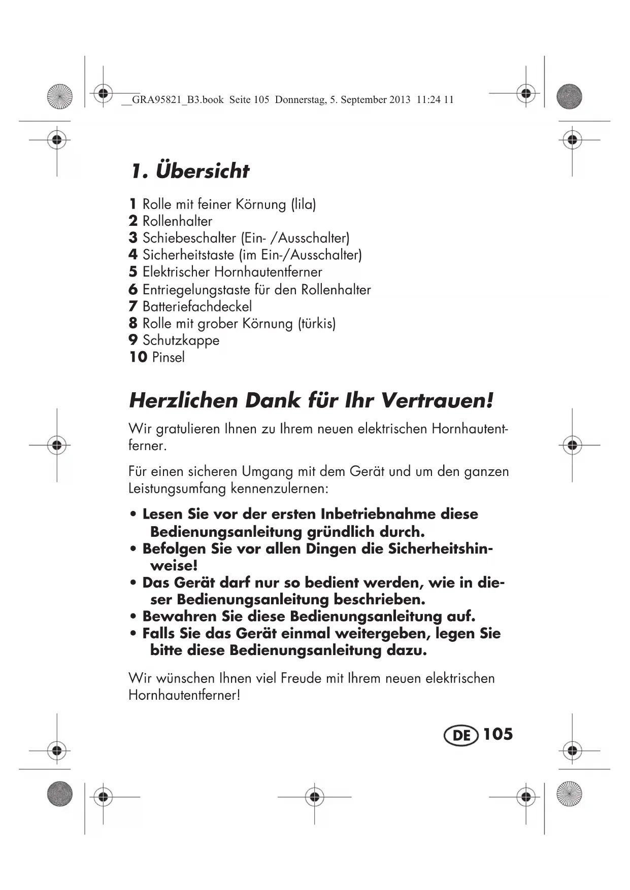 - Falls Sie das Gerät einmal weitergeben, legen Sie bitte diese Bedienungsanleitung dazu. Wir wünschen Ihnen viel Freude mit Ihrem neuen elektrischen Hornhautentferner! __GRA95821_B3.book Seite 105 Donnerstag, 5. September 2013 11:24 11106