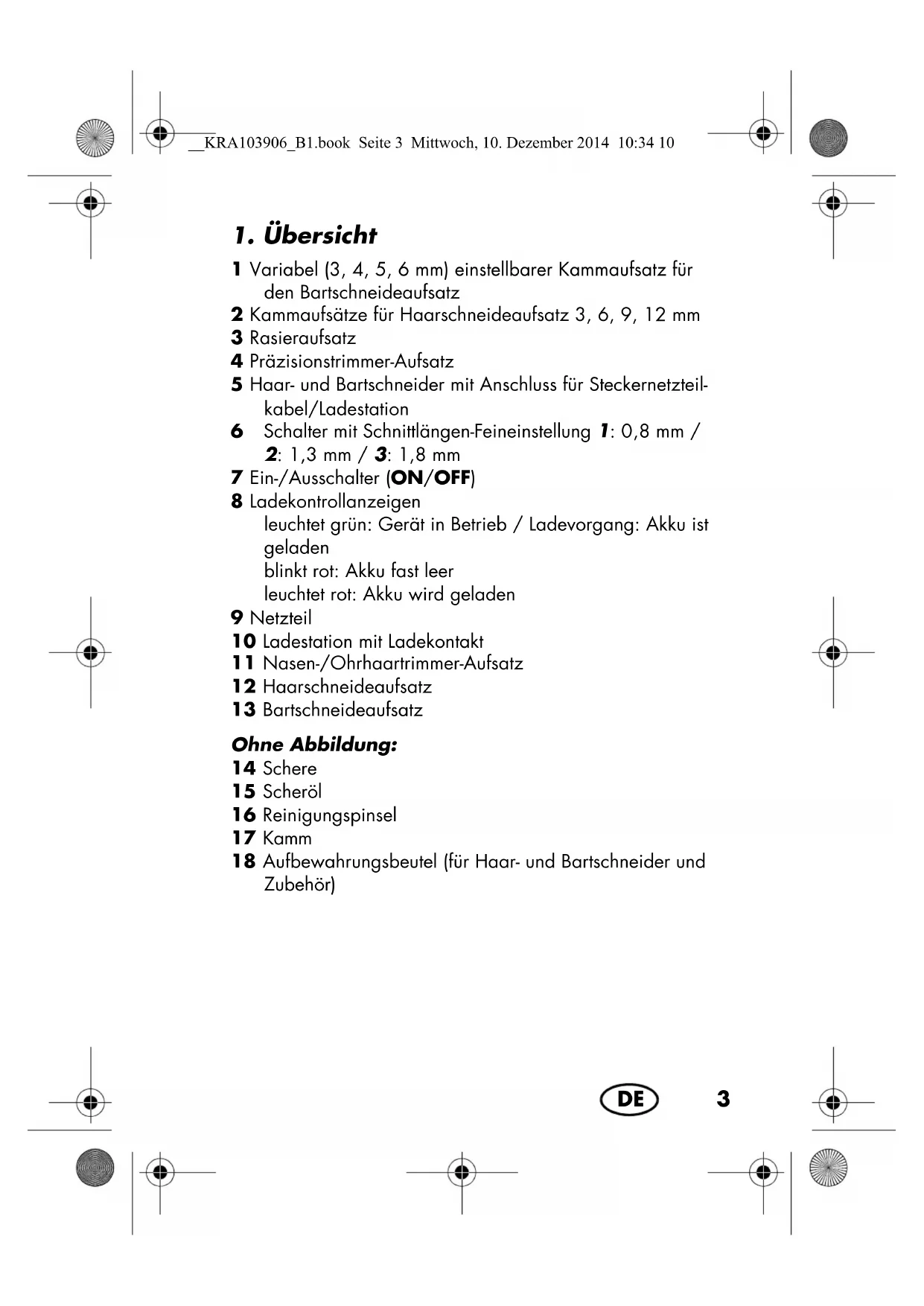 1 Haar- und Bartschneider 5in15 1 Netzteil9 1 Ladestation10 5 auswechselbare Schneideaufsätze: Haarschneideaufsatz12 Bartschneideaufsatz13 Präzisionstrimmer-Aufsatz4 Nasen-/Ohrhaartrimmer-Aufsatz11 Rasieraufsatz3 4Kammaufsätze2 für Haarschneideaufsatz 3, 6, 9, 12mm 1 variabel (3, 4, 5, 6mm) einstellbarer Kammaufsatz1 für den Bartschneideaufsatz13 1Kamm17 1Schere14 1Reinigungspinsel16 1Scheröl15 1 Aufbewahrungsbeutel (für Haar- und Bartschneider und Zu- behör)18 1 Bedienungsanleitung