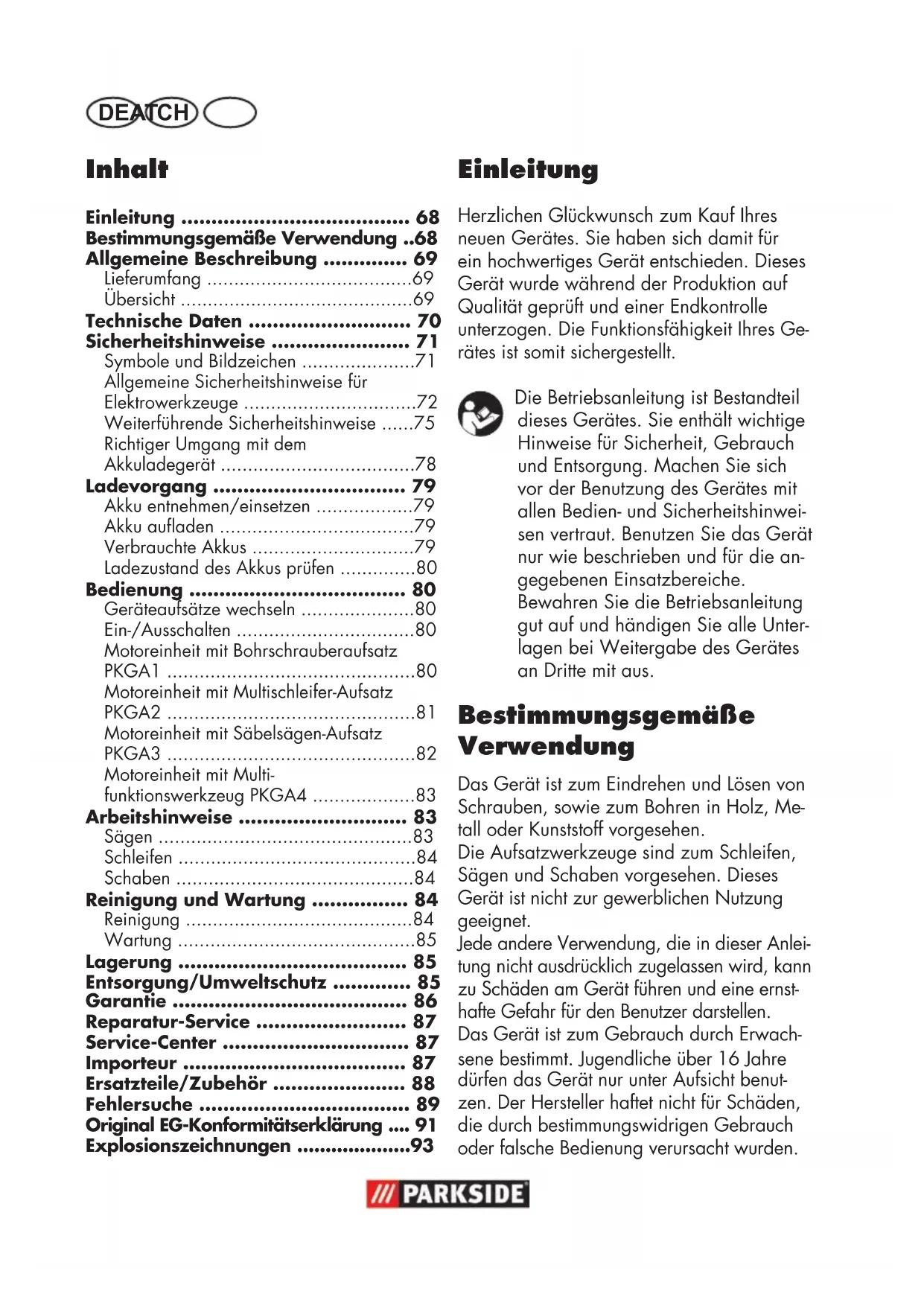 - Explosionszeichnungen Einleitung Herzlichen Glückwunsch zum Kauf Ihres neuen Gerätes. Sie haben sich damit für ein hochwertiges Gerät entschieden. Dieses Gerät wurde während der Produktion auf Qualität geprüft und einer Endkontrolle unterzogen. Die Funktionsfähigkeit Ihres Ge- rätes ist somit sichergestellt. Die Betriebsanleitung ist Bestandteil dieses Gerätes. Sie enthält wichtige Hinweise für Sicherheit, Gebrauch und Entsorgung. Machen Sie sich vor der Benutzung des Gerätes mit allen Bedien- und Sicherheitshinwei- sen vertraut. Benutzen Sie das Gerät nur wie beschrieben und für die an- gegebenen Einsatzbereiche. Bewahren Sie die Betriebsanleitung gut auf und händigen Sie alle Unter- lagen bei Weitergabe des Gerätes an Dritte mit aus. Bestimmungsgemäße Verwendung Das Gerät ist zum Eindrehen und Lösen von Schrauben, sowie zum Bohren in Holz, Me- tall oder Kunststoff vorgesehen. Die Aufsatzwerkzeuge sind zum Schleifen, Sägen und Schaben vorgesehen. Dieses Gerät ist nicht zur gewerblichen Nutzung geeignet. Jede andere Verwendung, die in dieser Anlei- tung nicht ausdrücklich zugelassen wird, kann zu Schäden am Gerät führen und eine ernst- hafte Gefahr für den Benutzer darstellen. Das Gerät ist zum Gebrauch durch Erwach- senebestimmt.Jugendlicheüber16Jahre dürfen das Gerät nur unter Aufsicht benut- zen. Der Hersteller haftet nicht für Schäden, die durch bestimmungswidrigen Gebrauch oder falsche Bedienung verursacht wurden.DE AT CH p. 93