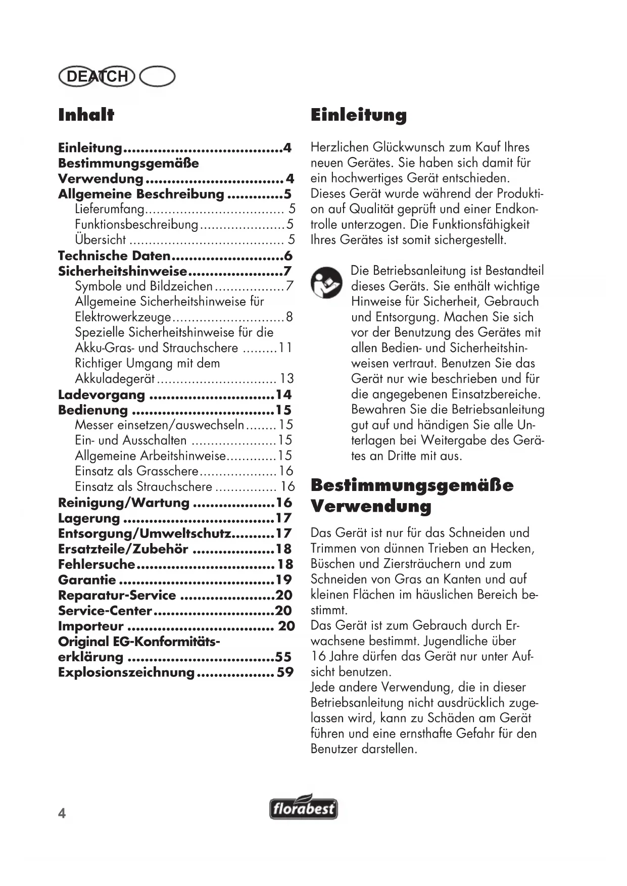 - DE AT CH Einleitung Herzlichen Glückwunsch zum Kauf Ihres neuen Gerätes. Sie haben sich damit für ein hochwertiges Gerät entschieden. Dieses Gerät wurde während der Produkti- on auf Qualität geprüft und einer Endkon- trolle unterzogen. Die Funktionsfähigkeit Ihres Gerätes ist somit sichergestellt. Die Betriebsanleitung ist Bestandteil dieses Geräts. Sie enthält wichtige Hinweise für Sicherheit, Gebrauch und Entsorgung. Machen Sie sich vor der Benutzung des Gerätes mit allen Bedien- und Sicherheitshin- weisen vertraut. Benutzen Sie das Gerät nur wie beschrieben und für die angegebenen Einsatzbereiche. Bewahren Sie die Betriebsanleitung gut auf und händigen Sie alle Un- terlagen bei Weitergabe des Gerä- tes an Dritte mit aus. Bestimmungsgemäße Verwendung Das Gerät ist nur für das Schneiden und Trimmen von dünnen Trieben an Hecken, Büschen und Ziersträuchern und zum Schneiden von Gras an Kanten und auf kleinen Flächen im häuslichen Bereich be- stimmt. Das Gerät ist zum Gebrauch durch Er- wachsene bestimmt. Jugendliche über 16Jahre dürfen das Gerät nur unter Auf- sicht benutzen. Jede andere Verwendung, die in dieser Betriebsanleitung nicht ausdrücklich zuge- lassen wird, kann zu Schäden am Gerät führen und eine ernsthafte Gefahr für den Benutzer darstellen. Inhalt Einleitung p. 4
