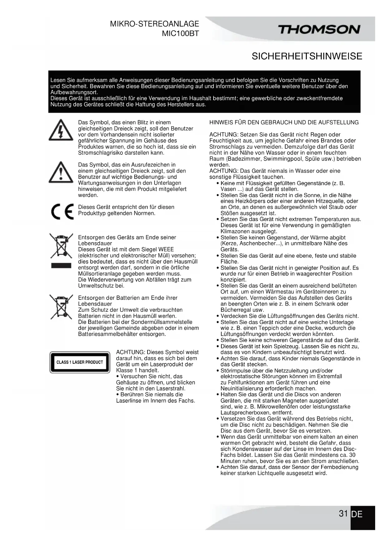 MIKRO-STEREOANLAGE MIC100/MIC101 Das Symbol, das einen Blitz in einem gleichseitigen Dreieck zeigt, soll den Benutzer vor dem Vorhandensein nicht isolierter gefährlicher Spannung im Gehäuse des Produktes warnen, die so hoch ist, dass sie ein Stromschlagrisiko darstellen kann. Lesen Sie aufmerksam alle Anweisungen dieser Bedienungsanleitung und befolgen Sie die Vorschriften zu Nutzung und Sicherheit. Bewahren Sie diese Bedienungsanleitung auf und informieren Sie eventuelle weitere Benutzer über den Aufbewahrungsort. Dieses Gerät ist ausschließlich für eine Verwendung im Haushalt bestimmt; eine gewerbliche oder zweckentfremdete Nutzung des Gerätes schließt die Haftung des Herstellers aus. Das Symbol, das ein Ausrufezeichen in einem gleichseitigen Dreieck zeigt, soll den Benutzer auf wichtige Bedienungs- und Wartungsanweisungen in den Unterlagen hinweisen, die mit dem Produkt mitgeliefert werden. Dieses Gerät entspricht den für diesen Produkttyp geltenden Normen. Entsorgen des Geräts am Ende seiner Lebensdauer Dieses Gerät ist mit dem Siegel WEEE (elektrischer und elektronischer Müll) versehen; dies bedeutet, dass es nicht über den Hausmüll entsorgt werden darf, sondern in die örtliche Müllsortieranlage gegeben werden muss. Die Wiederverwertung von Abfällen trägt zum Umweltschutz bei. Entsorgen der Batterien am Ende ihrer Lebensdauer Zum Schutz der Umwelt die verbrauchten Batterien nicht in den Hausmüll werfen. Die Batterien bei der Sondermüllsammelstelle der jeweiligen Gemeinde abgeben oder in einem Batteriesammelbehälter entsorgen. ACHTUNG: Dieses Symbol weist darauf hin, dass es sich bei dem Gerät um ein Laserprodukt der Klasse 1 handelt. pVersuchen Sie nicht, das Gehäuse zu öffnen, und blicken Sie nicht in den Laserstrahl. p#FSÔIren Sie niemals die Laserlinse im Innern des Fachs.