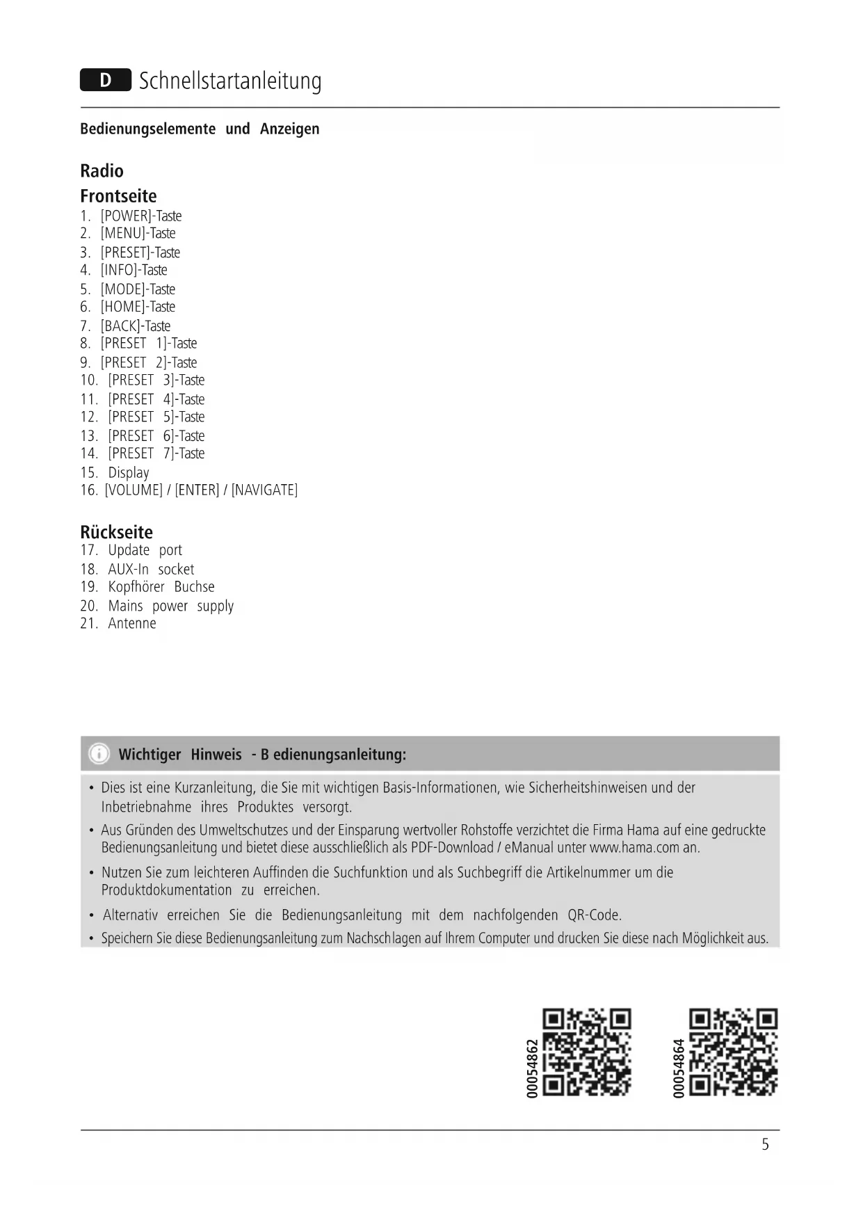 - Aus Gründen desUmweltschutzes und der Einsparungwertvoller Rohstoffe verzichtet die Firma Hama aufeine gedruckte Bedienungsanleitungund bietet diese ausschließlich alsPDF-Download /eManualunter www.hama.com an.