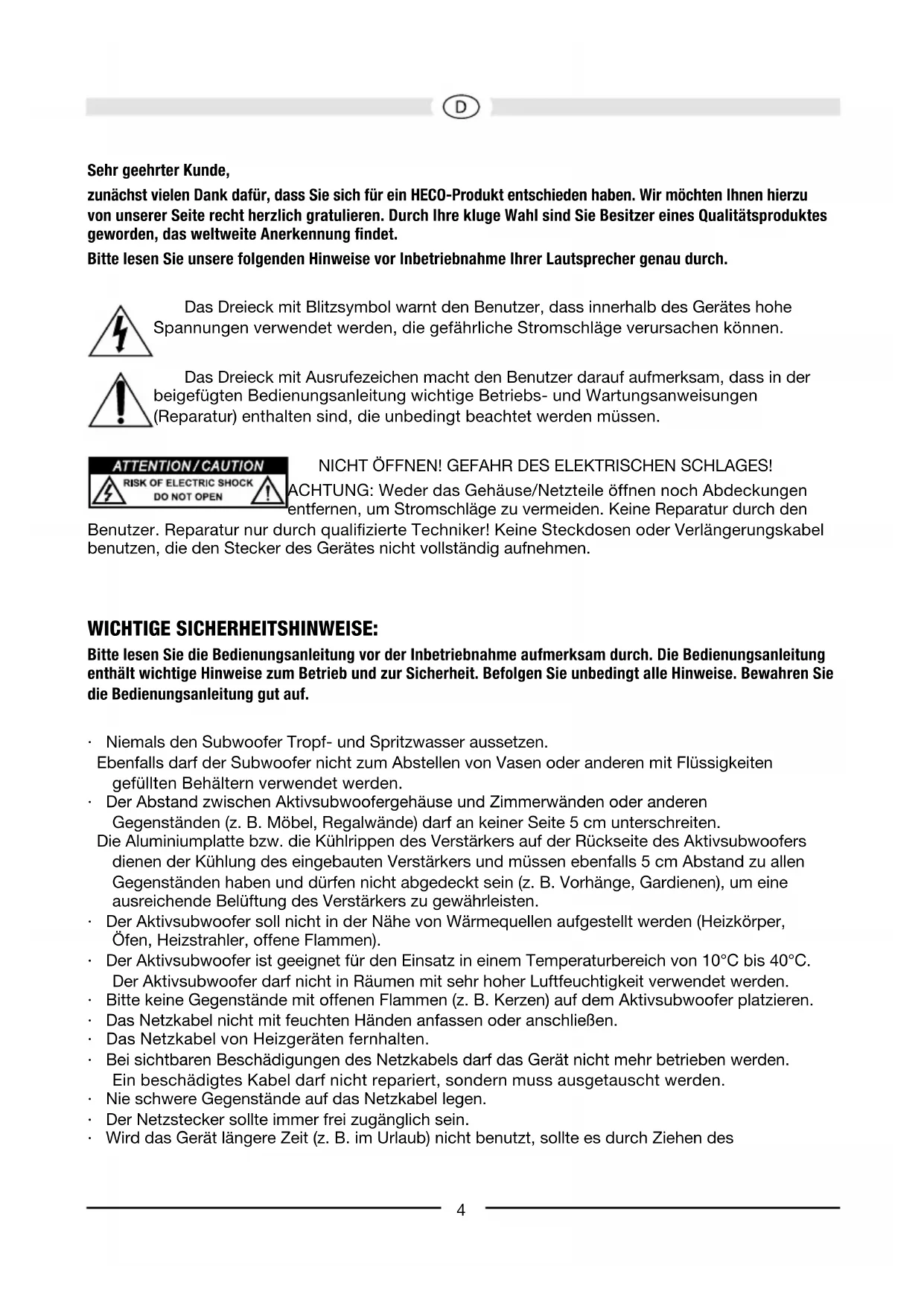 Abbildungen/Illustrations4 Sehr geehrter Kunde, zunächst vielen Dank dafür, dass Sie sich für ein HECO-Produkt entschieden haben. Wir möchten Ihnen hierzu von unserer Seite recht herzlich gratulieren. Durch Ihre kluge Wahl sind Sie Besitzer eines Qualitätsproduktes geworden, das weltweite Anerkennung ndet. Bitte lesen Sie unsere folgenden Hinweise vor Inbetriebnahme Ihrer Lautsprecher genau durch. Das Dreieck mit Blitzsymbol warnt den Benutzer, dass innerhalb des Gerätes hohe Spannungen verwendet werden, die gefährliche Stromschläge verursachen können. Das Dreieck mit Ausrufezeichen macht den Benutzer darauf aufmerksam, dass in der beigefügten Bedienungsanleitung wichtige Betriebs- und Wartungsanweisungen (Reparatur) enthalten sind, die unbedingt beachtet werden müssen. NICHT ÖFFNEN! GEFAHR DES ELEKTRISCHEN SCHLAGES! ACHTUNG: Weder das Gehäuse/Netzteile öffnen noch Abdeckungen entfernen, um Stromschläge zu vermeiden. Keine Reparatur durch den Benutzer. Reparatur nur durch qualizierte Techniker! Keine Steckdosen oder Verlängerungskabel benutzen, die den Stecker des Gerätes nicht vollständig aufnehmen. wichtige SicherheitShiNweiSe: Bitte lesen Sie die Bedienungsanleitung vor der Inbetriebnahme aufmerksam durch. Die Bedienungsanleitung enthält wichtige Hinweise zum Betrieb und zur Sicherheit. Befolgen Sie unbedingt alle Hinweise. Bewahren Sie die Bedienungsanleitung gut auf.