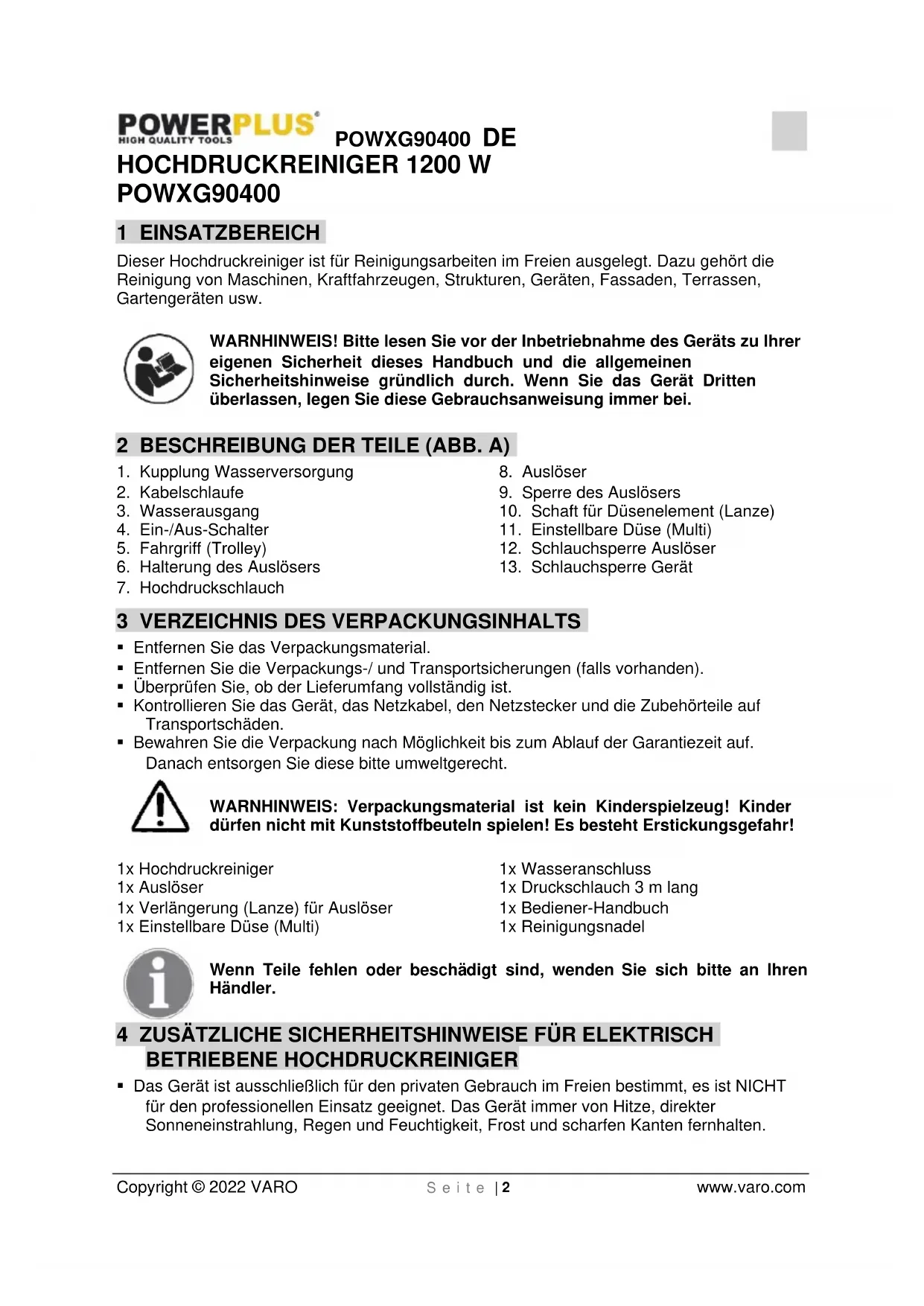 - Dieser Hochdruckreiniger darf bei Temperaturen von unter 0 °C nicht verwendet werden. WARNHINWEIS: Hochdruckschläuche, -anschlüsse und -kupplungen sind für die Sicherheit des Geräts von entscheidender Bedeutung. Deshalb dürfen nur Schläuche, Anschlüsse und Kupplungen verwendet werden, die vom Hersteller empfohlen werden. WARNHINWEIS: Unzureichend ausgelegte Verlängerungskabel sind eine große Gefahrenquelle. Um eine Überhitzung zu vermeiden, muss Kabel auf Rollen vor dem Einsatz erst komplett abgewickelt worden sein.POWXG90400 DE Copyright © 2022 VARO S e i t e | 4 www.varo.com