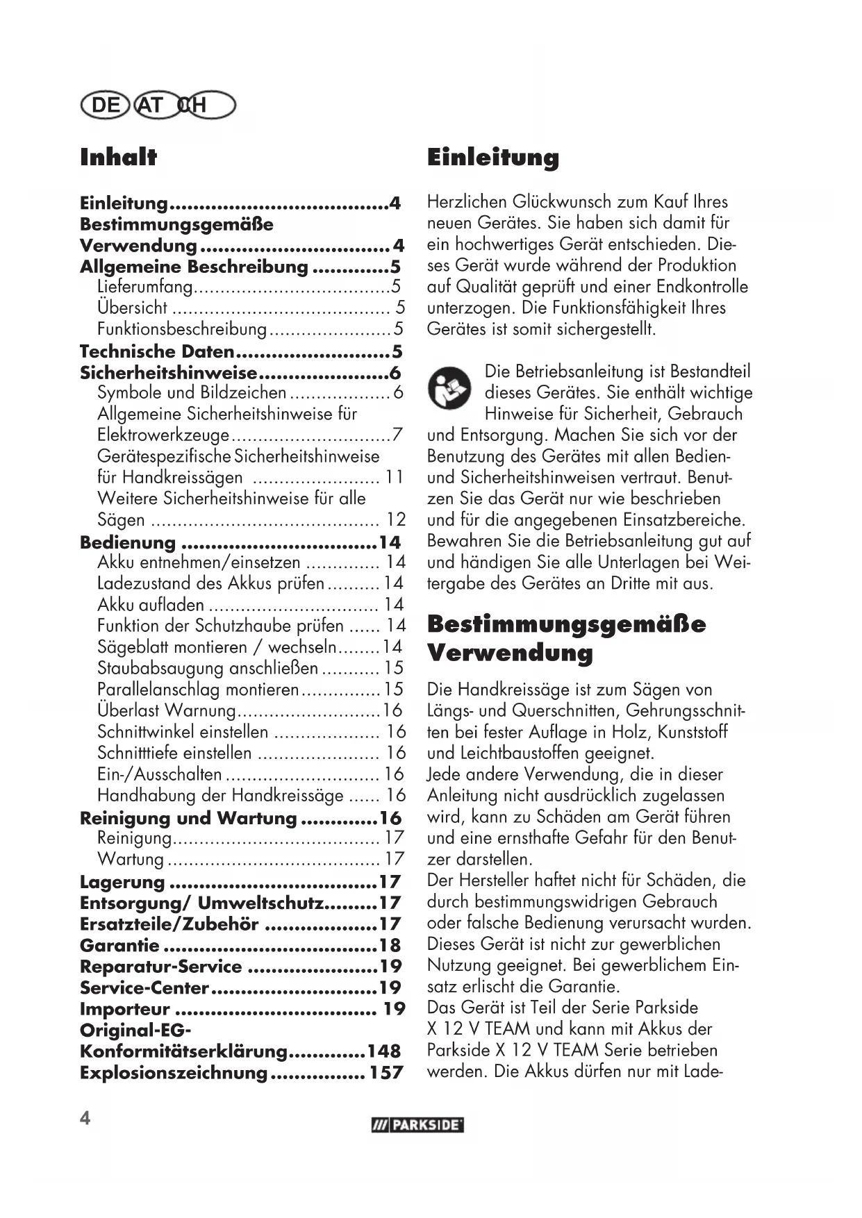 - Einleitung Herzlichen Glückwunsch zum Kauf Ihres neuen Gerätes. Sie haben sich damit für ein hochwertiges Gerät entschieden. Die- ses Gerät wurde während der Produktion auf Qualität geprüft und einer Endkontrolle unterzogen. Die Funktionsfähigkeit Ihres Gerätes ist somit sichergestellt. Die Betriebsanleitung ist Bestandteil dieses Gerätes. Sie enthält wichtige Hinweise für Sicherheit, Gebrauch und Entsorgung. Machen Sie sich vor der Benutzung des Gerätes mit allen Bedien- und Sicherheitshinweisen vertraut. Benut- zen Sie das Gerät nur wie beschrieben und für die angegebenen Einsatzbereiche. Bewahren Sie die Betriebsanleitung gut auf und händigen Sie alle Unterlagen bei Wei- tergabe des Gerätes an Dritte mit aus. Bestimmungsgemäße Verwendung Die Handkreissäge ist zum Sägen von Längs- und Querschnitten, Gehrungsschnit- ten bei fester Auage in Holz, Kunststoff und Leichtbaustoffen geeignet. Jede andere Verwendung, die in dieser Anleitung nicht ausdrücklich zugelassen wird, kann zu Schäden am Gerät führen und eine ernsthafte Gefahr für den Benut- zer darstellen. Der Hersteller haftet nicht für Schäden, die durch bestimmungswidrigen Gebrauch oder falsche Bedienung verursacht wurden. Dieses Gerät ist nicht zur gewerblichen Nutzung geeignet. Bei gewerblichem Ein- satz erlischt die Garantie. Das Gerät ist Teil der Serie Parkside X12VTEAM und kann mit Akkus der Parkside X12VTEAM Serie betrieben werden. Die Akkus dürfen nur mit Lade- Original-EG- Konformitätserklärung p. 148