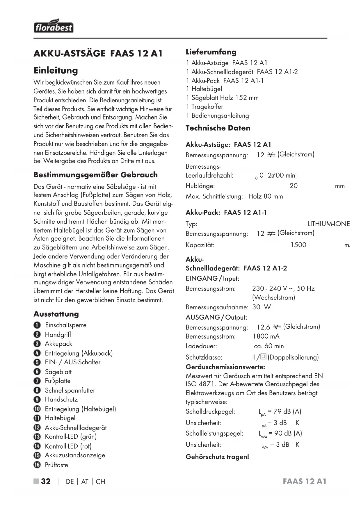 Einleitung Wir beglückwünschen Sie zum Kauf Ihres neuen Gerätes. Sie haben sich damit für ein hochwertiges Produkt entschieden. Die Bedienungsanleitung ist Teil dieses Produkts. Sie enthält wichtige Hinweise für Sicherheit, Gebrauch und Entsorgung. Machen Sie sich vor der Benutzung des Produkts mit allen Bedien- und Sicherheitshinweisen vertraut. Benutzen Sie das Produkt nur wie beschrieben und für die angegebe- nen Einsatzbereiche. Händigen Sie alle Unterlagen bei Weitergabe des Produkts an Dritte mit aus. Bestimmungsgemäßer Gebrauch Das Gerät - normativ eine Säbelsäge - ist mit festem Anschlag (Fußplatte) zum Sägen von Holz, Kunststoff und Baustoffen bestimmt. Das Gerät eig- net sich für grobe Sägearbeiten, gerade, kurvige Schnitte und trennt Flächen bündig ab. Mit mon- tiertem Haltebügel ist das Gerät zum Sägen von Ästen geeignet. Beachten Sie die Informationen zu Sägeblättern und Arbeitshinweise zum Sägen. Jede andere Verwendung oder Veränderung der Maschine gilt als nicht bestimmungsgemäß und birgt erhebliche Unfallgefahren. Für aus bestim- mungswidriger Verwendung entstandene Schäden übernimmt der Hersteller keine Haftung. Das Gerät ist nicht für den gewerblichen Einsatz bestimmt. Ausstattung Einschaltsperre Handgriff Akkupack Entriegelung (Akkupack) EIN- / AUS-Schalter Sägeblatt Fußplatte Schnellspannfutter Handschutz Entriegelung (Haltebügel) Haltebügel Akku-Schnellladegerät Kontroll-LED (grün) Kontroll-LED (rot) Akkuzustandsanzeige Prüftaste Lieferumfang 1 Akku-Astsäge FAAS 12 A1 1 Akku-Schnellladegerät FAAS 12 A1-2 1 Akku-Pack FAAS 12 A1-1 1 Haltebügel 1 Sägeblatt Holz 152 mm 1 Tragekoffer 1 Bedienungsanleitung Technische Daten Akku-Astsäge: FAAS 12 A1 Bemessungsspannung: 12 V (Gleichstrom) Bemessungs- Leerlaufdrehzahl: n