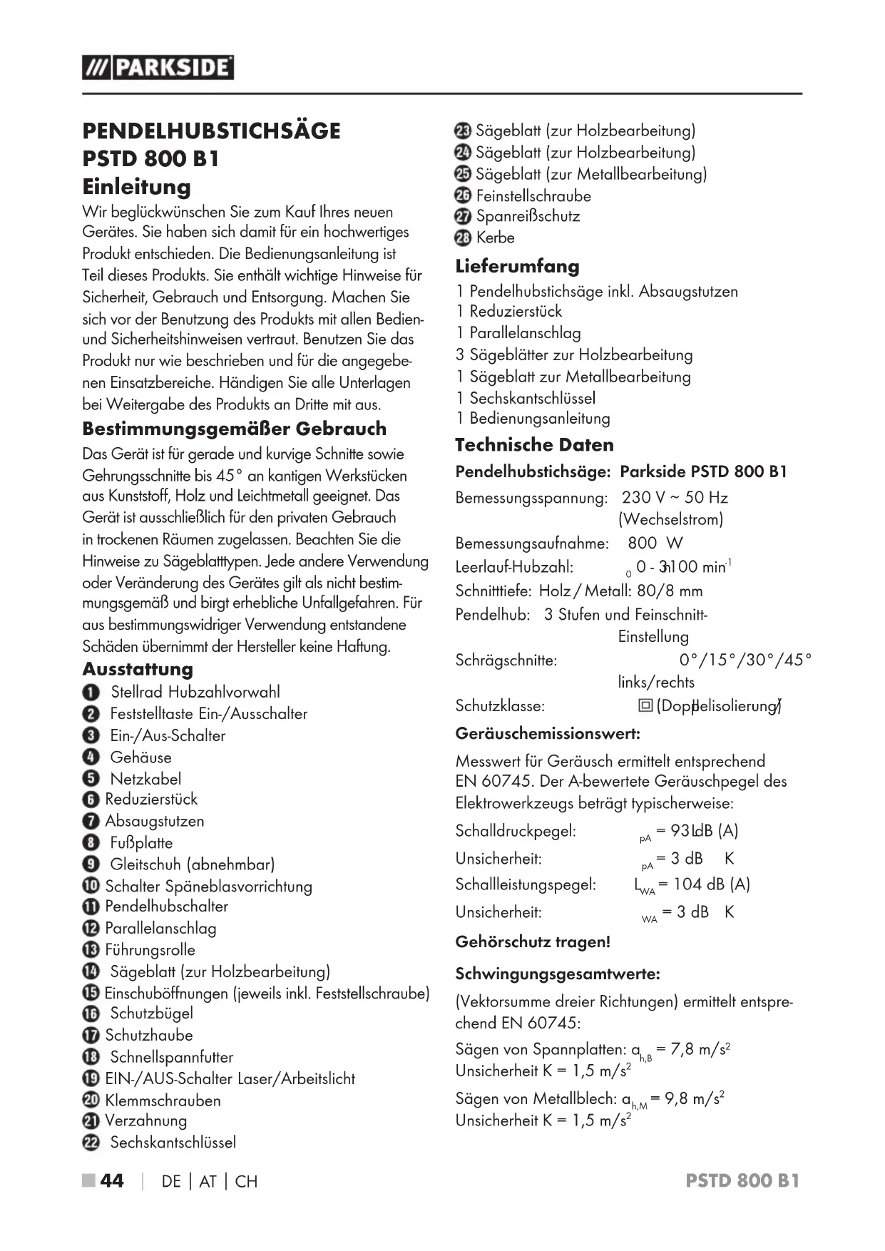 PENDELHUBSTICHSÄGE PSTD 800 B1 Einleitung Wir beglückwünschen Sie zum Kauf Ihres neuen Gerätes. Sie haben sich damit für ein hochwertiges Produkt entschieden. Die Bedienungsanleitung ist Teil dieses Produkts. Sie enthält wichtige Hinweise für Sicherheit, Gebrauch und Entsorgung. Machen Sie sich vor der Benutzung des Produkts mit allen Bedien- und Sicherheitshinweisen vertraut. Benutzen Sie das Produkt nur wie beschrieben und für die angegebe- nen Einsatzbereiche. Händigen Sie alle Unterlagen bei Weitergabe des Produkts an Dritte mit aus. Bestimmungsgemäßer Gebrauch Das Gerät ist für gerade und kurvige Schnitte sowie Gehrungsschnitte bis 45° an kantigen Werkstücken aus Kunststoff, Holz und Leichtmetall geeignet. Das Gerät ist ausschließlich für den privaten Gebrauch in trockenen Räumen zugelassen. Beachten Sie die Hinweise zu Sägeblatttypen. Jede andere Verwendung oder Veränderung des Gerätes gilt als nicht bestim- mungsgemäß und birgt erhebliche Unfallgefahren. Für aus bestimmungswidriger Verwendung entstandene Schäden übernimmt der Hersteller keine Haftung. Ausstattung Stellrad Hubzahlvorwahl Feststelltaste Ein-/Ausschalter Ein-/Aus-Schalter Gehäuse Netzkabel Reduzierstück Absaugstutzen Fußplatte Gleitschuh (abnehmbar) Schalter Späneblasvorrichtung Pendelhubschalter Parallelanschlag Führungsrolle Sägeblatt (zur Holzbearbeitung) Einschuböffnungen (jeweils inkl. Feststellschraube) Schutzbügel Schutzhaube Schnellspannfutter EIN-/AUS-Schalter Laser/Arbeitslicht Klemmschrauben Verzahnung Sechskantschlüssel Sägeblatt (zur Holzbearbeitung) Sägeblatt (zur Holzbearbeitung) Sägeblatt (zur Metallbearbeitung) Feinstellschraube Spanreißschutz Kerbe Lieferumfang 1 Pendelhubstichsäge inkl. Absaugstutzen 1 Reduzierstück 1 Parallelanschlag 3 Sägeblätter zur Holzbearbeitung 1 Sägeblatt zur Metallbearbeitung 1 Sechskantschlüssel 1 Bedienungsanleitung Technische Daten Pendelhubstichsäge: Parkside PSTD 800 B1 Bemessungsspannung: 230 V ∼ 50 Hz (Wechselstrom) Bemessungsaufnahme: 800 W Leerlauf-Hubzahl: n
