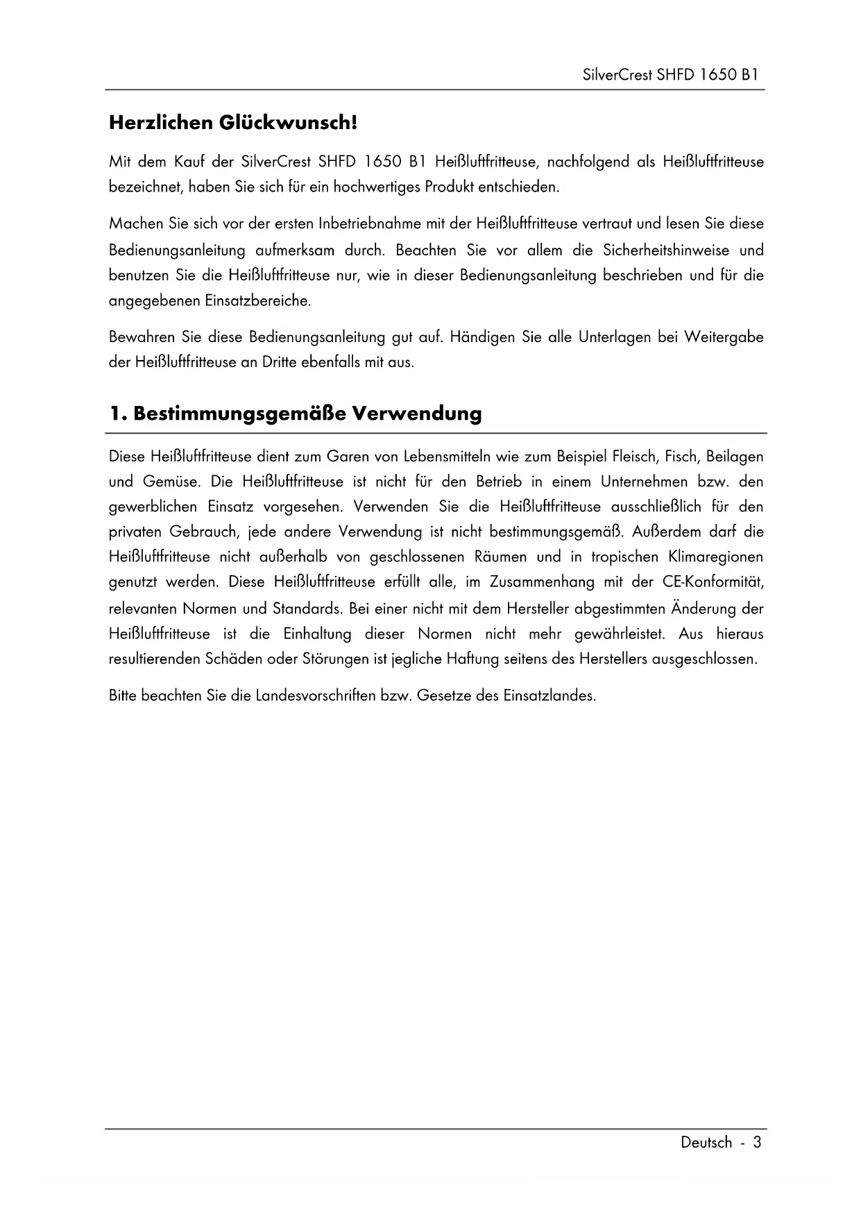 Deutsch - 3 Herzlichen Glückwunsch! Mit dem Kauf der SilverCrest SHFD 1650 B1 Heißluftfritteuse, nachfolgend als Heißluftfritteuse bezeichnet, haben Sie sich für ein hochwertiges Produkt entschieden. Machen Sie sich vor der ersten Inbetriebnahme mit der Heißluftfritteuse vertraut und lesen Sie diese Bedienungsanleitung aufmerksam durch. Beachten Sie vor allem die Sicherheitshinweise und benutzen Sie die Heißluftfritteuse nur, wie in dieser Bedienungsanleitung beschrieben und für die angegebenen Einsatzbereiche. Bewahren Sie diese Bedienungsanleitung gut auf. Händigen Sie alle Unterlagen bei Weitergabe der Heißluftfritteuse an Dritte ebenfalls mit aus.