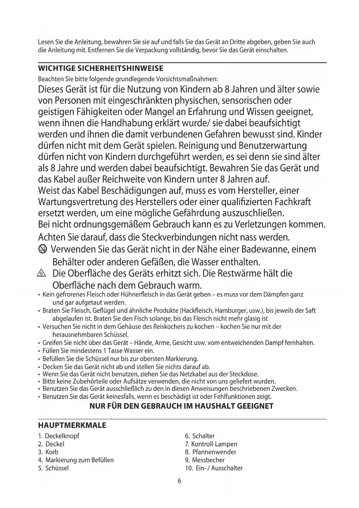 - Benutzen Sie das Gerät keinesfalls, wenn es beschädigt ist oder Fehlfunktionen zeigt. NUR FÜR DEN GEBRAUCH IM HAUSHALT GEEIGNET HAUPTMERKMALE