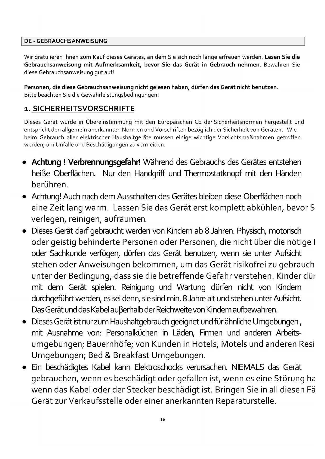 - Achtung! Verbrennungsgefahr! Während des Gebrauchs des Gerätes entstehen heiße Oberflächen. Nur den Handgriff und Thermostatknopf mit den Händen berühren.