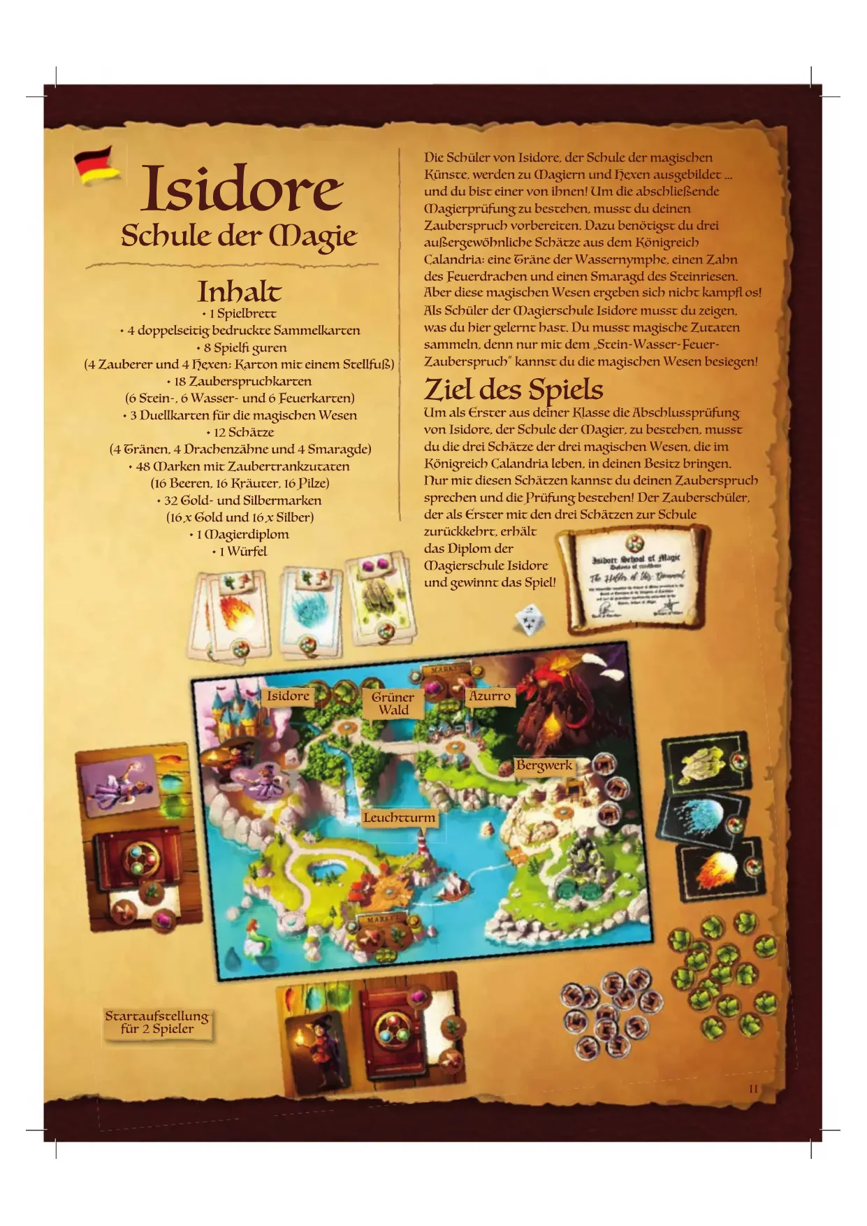 - Wenn die Schüler dieselbe Spruchkarte spielen, heben die Elemente sich gegenseitig auf, und es gewinnt keiner von ihnen. Nach einem Duell ist der linke Nachbar des Angreifers am Zug, und es darf nichts mehr gesammelt, getauscht oder gekauft werden. Beide Schüler behalten auch ihre eigenen Zauberspruchkarten. Tipp: Es kann sein, dass ein Spieler ein Duell nicht gewinnen kann, weil er überhaupt noch keine oder noch nicht die richtigen Zauberspruchkarten besitzt. Daher ist es wichtig, dass du dir immer gut merkst, welche Zauberspruchkarten die anderen Spieler schon gesammelt haben, bevor du dich für ein Duell entscheidest. Ein Duell mit einem Spieler, der noch keine Zauberspruchkarten besitzt, gewinnst du immer. 15Green Forest Start setup for 2 players Isidore Lighthouse Azurro Mines Isidore School of Magic Contents