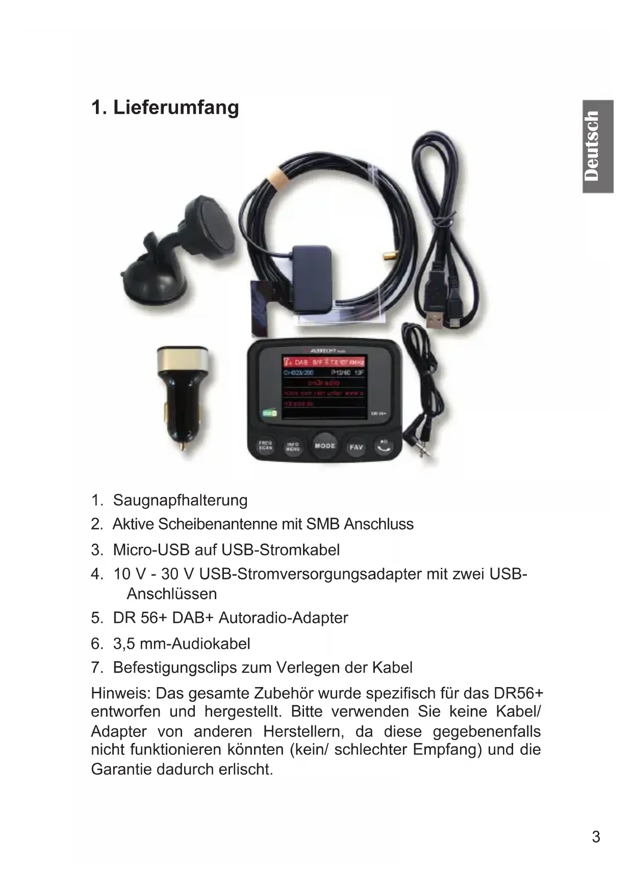 Hinweis: Das gesamte Zubehör wurde spezisch für das DR56+ entworfen und hergestellt. Bitte verwenden Sie keine Kabel/ Adapter von anderen Herstellern, da diese gegebenenfalls nicht funktionieren könnten (kein/ schlechter Empfang) und die Garantie dadurch erlischt.4 Deutsch