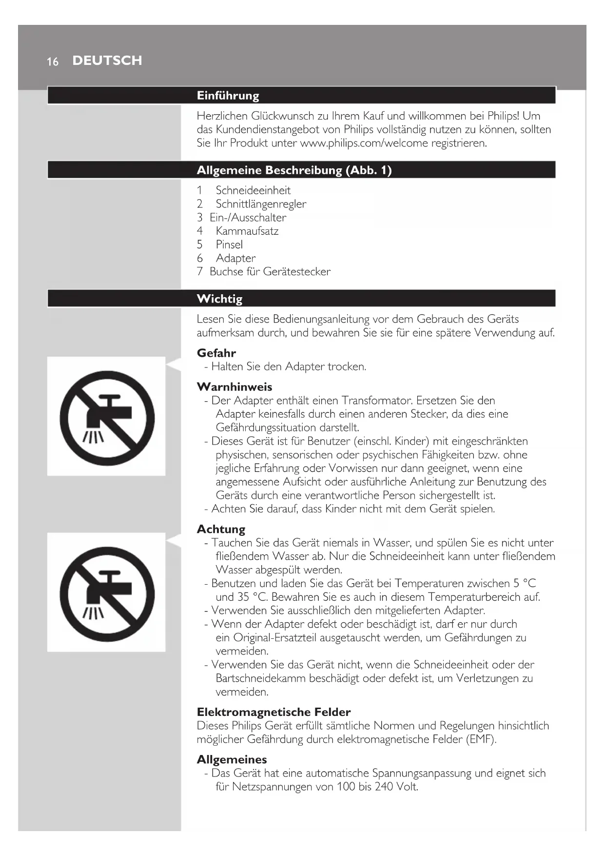 Apparatet må ikke smides ud sammen med almindeligt husholdningsaffald, når det til sin tid kasseres. Aevér det i stedet på en kommunal genbrugsstation. På den måde er du med til at beskytte miljøet. Sikkerhed og support Hvis du har brug for hjælp eller support, bedes du besøge www.philips.com/support eller læse i den separate folder “World-Wide Guarantee”. DANSK 1516 Einführung Herzlichen Glückwunsch zu Ihrem Kauf und willkommen bei Philips! Um das Kundendienstangebot von Philips vollständig nutzen zu können, sollten Sie Ihr Produkt unter www.philips.com/welcome registrieren. Allgemeine Beschreibung (Abb. 1) 1 Schneideeinheit 2 Schnittlängenregler 3 Ein-/Ausschalter 4 Kammaufsatz 5 Pinsel 6 Adapter 7 Buchse für Gerätestecker Wichtig Lesen Sie diese Bedienungsanleitung vor dem Gebrauch des Geräts aufmerksam durch, und bewahren Sie sie für eine spätere Verwendung auf. Gefahr - Halten Sie den Adapter trocken. Warnhinweis - Der Adapter enthält einen Transformator. Ersetzen Sie den Adapter keinesfalls durch einen anderen Stecker, da dies eine Gefährdungssituation darstellt. - Dieses Gerät ist für Benutzer (einschl. Kinder) mit eingeschränkten physischen, sensorischen oder psychischen Fähigkeiten bzw. ohne jegliche Erfahrung oder Vorwissen nur dann geeignet, wenn eine angemessene Aufsicht oder ausführliche Anleitung zur Benutzung des Geräts durch eine verantwortliche Person sichergestellt ist. - Achten Sie darauf, dass Kinder nicht mit dem Gerät spielen. Achtung - Tauchen Sie das Gerät niemals in Wasser, und spülen Sie es nicht unter ießendem Wasser ab. Nur die Schneideeinheit kann unter ießendem Wasser abgespült werden. - Benutzen und laden Sie das Gerät bei Temperaturen zwischen 5 °C und 35 °C. Bewahren Sie es auch in diesem Temperaturbereich auf. - Verwenden Sie ausschließlich den mitgelieferten Adapter. - Wenn der Adapter defekt oder beschädigt ist, darf er nur durch ein Original-Ersatzteil ausgetauscht werden, um Gefährdungen zu vermeiden. - Verwenden Sie das Gerät nicht, wenn die Schneideeinheit oder der Bartschneidekamm beschädigt oder defekt ist, um Verletzungen zu vermeiden. Elektromagnetische Felder Dieses Philips Gerät erfüllt sämtliche Normen und Regelungen hinsichtlich möglicher Gefährdung durch elektromagnetische Felder (EMF). Allgemeines - Das Gerät hat eine automatische Spannungsanpassung und eignet sich für Netzspannungen von 100 bis 240 Volt. DEUTSCH- Der Adapter wandelt Netzspannungen von 100 bis 240 Volt in eine sichere Betriebsspannung von unter 24 Volt um. Für den Gebrauch vorbereiten Hinweis: Das Gerät kann nur direkt über eine Steckdose betrieben werden. Vorbereitung des Geräts 1 Vergewissern Sie sich, dass das Gerät ausgeschaltet ist. 2 Stecken Sie den Gerätestecker in das Gerät (1), und schließen Sie den Adapter an eine Steckdose an (2). Das Gerät benutzen Die Schnittlängeneinstellungen werden in Millimetern angegeben. Der Kamm schneidet die Haare auf eine Länge von 1 mm bis 23 mm. Die Einstellungen zeigen die verbleibende Barthaarlänge nach dem Schneiden an. Seien Sie bei der ersten Anwendung besonders vorsichtig. Gehen Sie langsam, mit ruhigen und kontrollierten Bewegungen vor. Tipp: Beginnen Sie das Trimmen mit einer hohen Längeneinstellung, und verringern Sie die Längeneinstellung allmählich, bis Sie die gewünschte Haarlänge erreicht haben. Mit Kammaufsatz schneiden 1 Setzen Sie den Kammaufsatz auf das Gerät. DEUTSCH 172 Drehen Sie den Schnittlängenregler auf die gewünschte Längeneinstellung. Hinweis: Wenn Sie das Gerät zum ersten Mal verwenden, schneiden Sie zunächst mit der maximalen Längeneinstellung, um sich mit dem Gerät vertraut zu machen. 3 Schalten Sie das Gerät ein. 4 Die besten Ergebnisse erzielen Sie, wenn Sie den Bartschneider gegen die Haarwuchsrichtung führen. Achten Sie darauf, dass der Kamm stets in Kontakt mit der Haut bleibt. Ohne Kammaufsatz schneiden Verwenden Sie den Trimmer ohne den Kammaufsatz, um Haare sehr nah an der Haut abzuschneiden (0,5 mm) oder um die Konturen am Nacken und den Koteletten zu denieren. Seien Sie vorsichtig, wenn Sie ohne Kammaufsatz arbeiten, da die Schneideeinheit sofort alle Haare schneidet, mit denen sie in Berührung kommt. 1 Ziehen Sie den Kammaufsatz vom Gerät. 2 Schalten Sie das Gerät ein. DEUTSCH183 Gehen Sie mit ruhigen und gleichmäßigen Bewegungen vor. Berühren Sie die Haare nur leicht mit dem Gerät. Pege Benutzen Sie zum Reinigen des Geräts keine Scheuerschwämme und -mittel oder aggressive Flüssigkeiten wie Alkohol, Benzin oder Azeton. Tauchen Sie das Gerät niemals in Wasser. Spülen Sie es auch nicht unter ießendem Wasser ab. Hinweis: Nur die Schneideeinheit und der Kamm können mit Wasser gereinigt werden. 1 Achten Sie darauf, dass das Gerät ausgeschaltet und nicht an das Netz angeschlossen ist. 2 Reinigen Sie das Gehäuse des Geräts mit einem trockenen Tuch. 3 Entfernen Sie den Kammaufsatz, und reinigen Sie ihn mit der Bürste, oder spülen Sie ihn unter ießendem Wasser aus. 4 Drücken Sie die Entriegelungstaste (1). Die Schneideeinheit löst sich vom Gerät (2). 5 Reinigen Sie die Schneideeinheit mit der Bürste, oder spülen Sie sie unter ießendem Wasser. DEutsCH 196 Reinigen Sie das Innere des Geräts mit der Bürste. Tauchen Sie das Gerät niemals in Wasser. Spülen Sie es auch nicht unter ießendem Wasser ab. 7 Schütteln Sie überschüssiges Wasser ab. Um die Schneideeinheit wieder anzubringen, schieben Sie die Führung der Schneideeinheit in den Schlitz. 8 Schieben Sie die Führung der Schneideeinheit in den Schlitz (1), und drücken Sie die Schneideeinheit wieder auf das Gerät (2). Ersatz Tauschen Sie abgenutzte oder beschädigte Schneideeinheiten nur durch Original Philips Schneideeinheiten aus. Ersatzteile sind bei Philips Service- Centern erhältlich. 1 Drücken Sie die Entriegelungstaste (1). Die Schneideeinheit löst sich vom Gerät (2). 2 Schieben Sie die Führung der neuen Schneideeinheit in den 