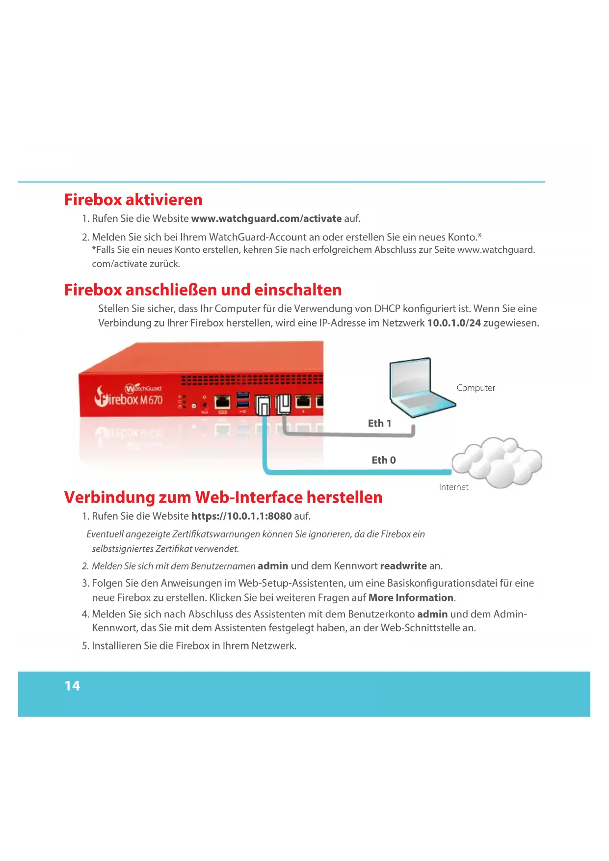 Eth 1 Eth 0 ComputerInternet15 Wenn Sie den Web-Setup-Assistenten ausgeführt haben, hat die Firebox eine Grundkonguration:• Ausgehende FTP-, Ping-, DNS-, TCP- und UDP-Verbindungen sind zugelassen• Blockierung von nicht angefordertem Datenverkehr aus dem externen Netzwerk• Prüfung von eingehendem Datenverkehr über FTP, HTTP und HTTPS• Lizenzierte Sicherheitsdienste zum Schutz vertrauenswürdiger und optionaler Netzwerke Weitere Schritte Herzlichen Glückwunsch! Sie haben das Basis-Setup für Ihre Firebox abgeschlossen. Über das Web-Interface können Sie Ihre Konguration anzeigen lassen sowie bearbeiten und Ihre Firebox verwalten und überwachen. Alternativ können Sie den WatchGuard System Manager (WSM) herunterladen und installieren und den Policy Manager und die WSM-Suite mit Management- und Überwachungstools verwenden. Tipps für den Start: Internetverbindung überprüfen