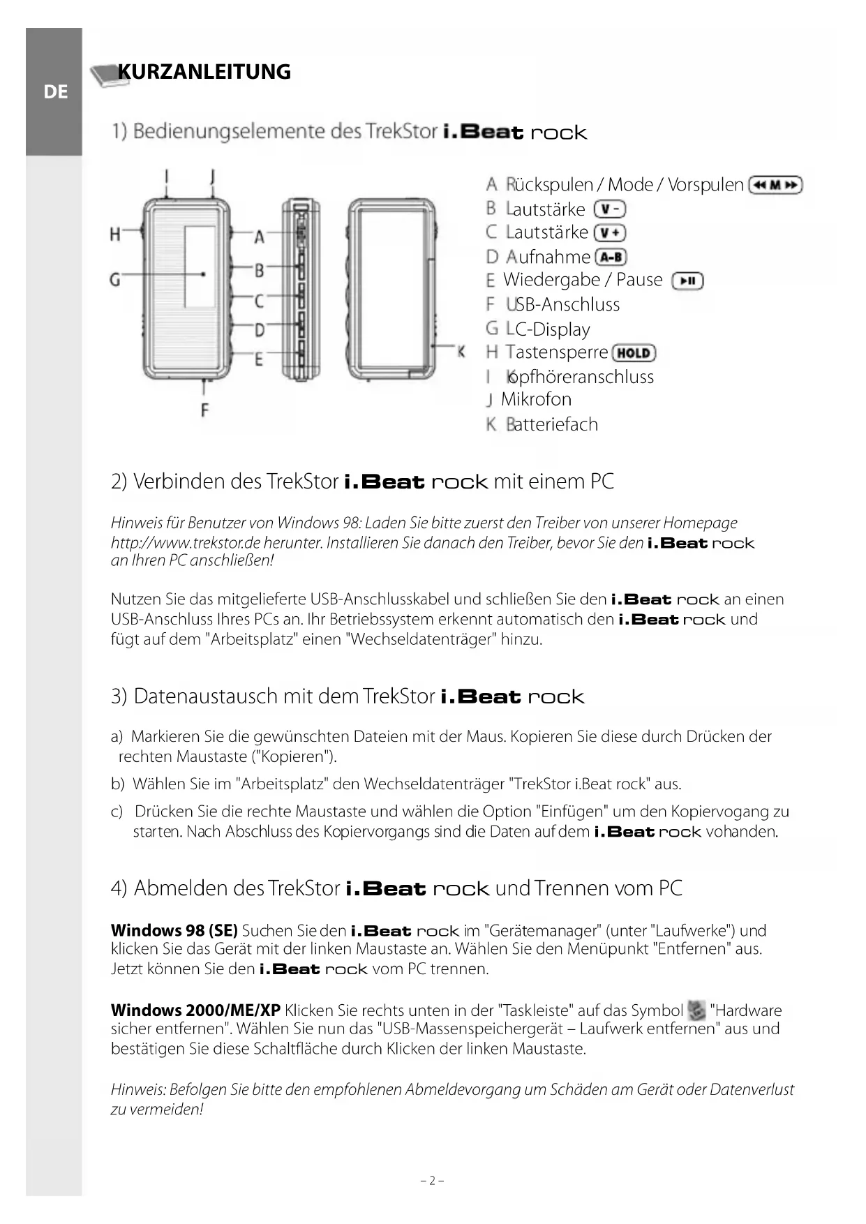 Windows 98 (SE) Suchen Sie den i.Beat rock im "Gerätemanager" (unter "Laufwerke") und klicken Sie das Gerät mit der linken Maustaste an. Wählen Sie den Menüpunkt "Entfernen" aus. Jetzt können Sie den i.Beat rock vom PC trennen. Windows 2000/ME/XP Klicken Sie rechts unten in der "Taskleiste" auf das Symbol "Hardware sicher entfernen". Wählen Sie nun das "USB-Massenspeichergerät – Laufwerk entfernen" aus und bestätigen Sie diese Schaltfläche durch Klicken der linken Maustaste. Hinweis: Befolgen Sie bitte den empfohlenen Abmeldevorgang um Schäden am Gerät oder Datenverlust zu vermeiden! A Rückspulen / Mode / Vorspulen B Lautstärke C Lautstärke D Aufnahme E Wiedergabe / Pause F USB-Anschluss G LC-Display H Tastensperre I Kopfhöreranschluss J Mikrofon K BatteriefachDE – 2 – – 3 –