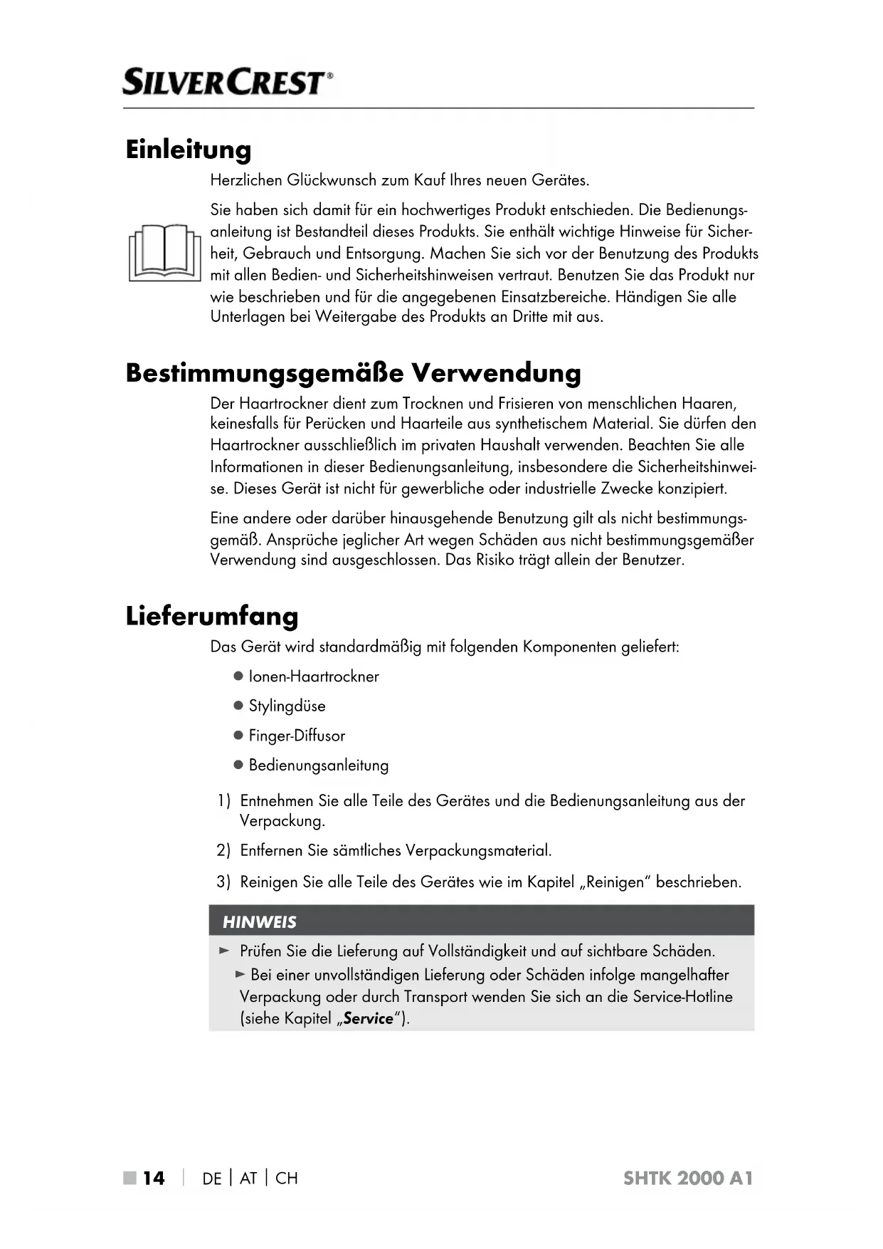 SHTK 2000 A1 Einleitung Herzlichen Glückwunsch zum Kauf Ihres neuen Gerätes. Sie haben sich damit für ein hochwertiges Produkt entschieden. Die Bedienungs- anleitung ist Bestandteil dieses Produkts. Sie enthält wichtige Hinweise für Sicher- heit, Gebrauch und Entsorgung. Machen Sie sich vor der Benutzung des Produkts mit allen Bedien- und Sicherheitshinweisen vertraut. Benutzen Sie das Produkt nur wie beschrieben und für die angegebenen Einsatzbereiche. Händigen Sie alle Unterlagen bei Weitergabe des Produkts an Dritte mit aus. Bestimmungsgemäße Verwendung Der Haartrockner dient zum Trocknen und Frisieren von menschlichen Haaren, keinesfalls für Perücken und Haarteile aus synthetischem Material. Sie dürfen den Haartrockner ausschließlich im privaten Haushalt verwenden. Beachten Sie alle Informationen in dieser Bedienungsanleitung, insbesondere die Sicherheitshinwei- se. Dieses Gerät ist nicht für gewerbliche oder industrielle Zwecke konzipiert. Eine andere oder darüber hinausgehende Benutzung gilt als nicht bestimmungs- gemäß. Ansprüche jeglicher Art wegen Schäden aus nicht bestimmungsgemäßer Verwendung sind ausgeschlossen. Das Risiko trägt allein der Benutzer. Lieferumfang Das Gerät wird standardmäßig mit folgenden Komponenten geliefert: ▯ Ionen-Haartrockner ▯ Stylingdüse ▯ Finger-Diffusor ▯ Bedienungsanleitung