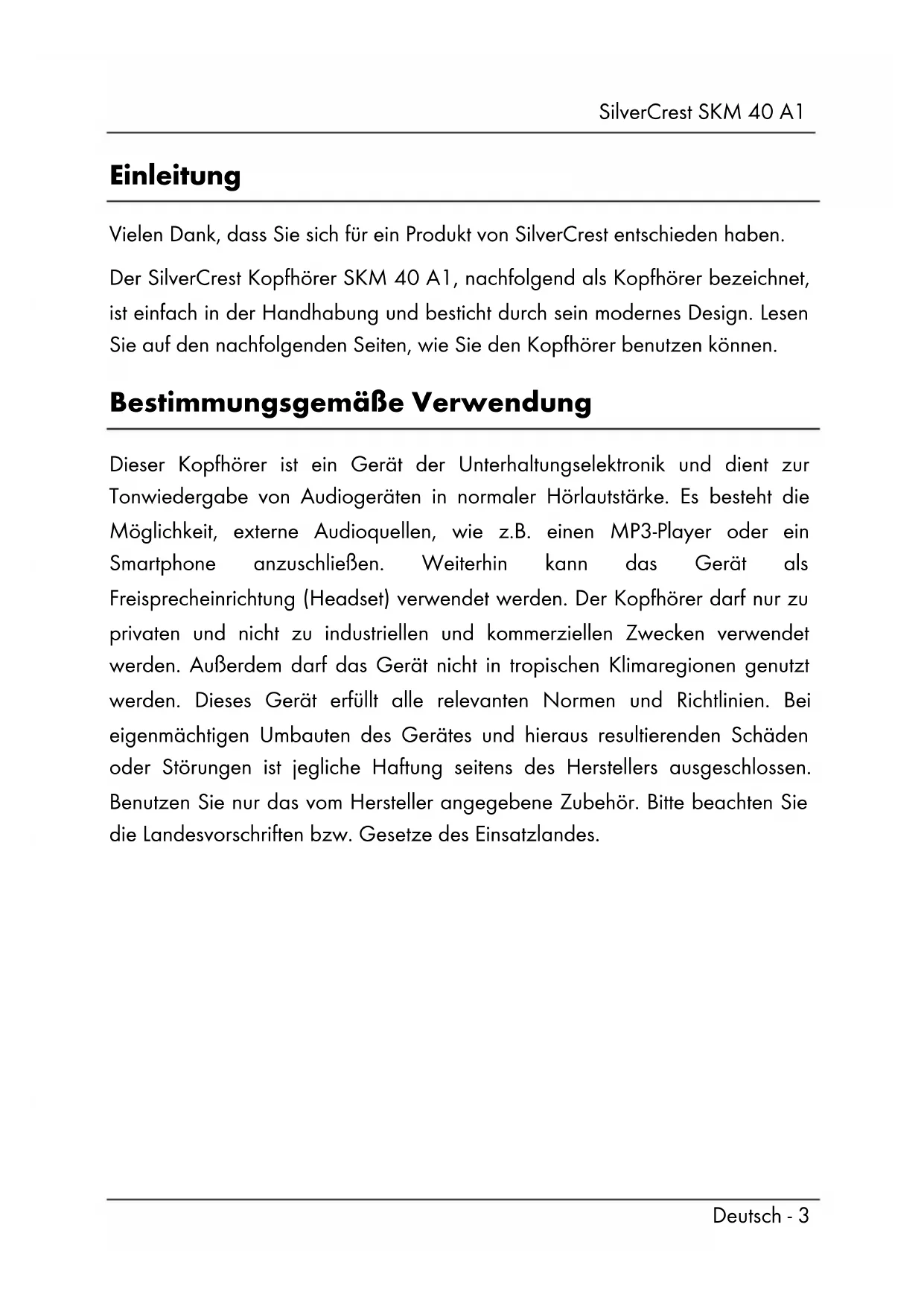 - Hinweise zu Garantie und Serviceabwicklung SilverCrest SKM 40 A1 Deutsch - 3 Einleitung Vielen Dank, dass Sie sich für ein Produkt von SilverCrest entschieden haben. Der SilverCrest Kopfhörer SKM 40 A1, nachfolgend als Kopfhörer bezeichnet, ist einfach in der Handhabung und besticht durch sein modernes Design. Lesen Sie auf den nachfolgenden Seiten, wie Sie den Kopfhörer benutzen können. Bestimmungsgemäße Verwendung Dieser Kopfhörer ist ein Gerät der Unterhaltungselektronik und dient zur Tonwiedergabe von Audiogeräten in normaler Hörlautstärke. Es besteht die Möglichkeit, externe Audioquellen, wie z.B. einen MP3-Player oder ein Smartphone anzuschließen. Weiterhin kann das Gerät als Freisprecheinrichtung (Headset) verwendet werden. Der Kopfhörer darf nur zu privaten und nicht zu industriellen und kommerziellen Zwecken verwendet werden. Außerdem darf das Gerät nicht in tropischen Klimaregionen genutzt werden. Dieses Gerät erfüllt alle relevanten Normen und Richtlinien. Bei eigenmächtigen Umbauten des Gerätes und hieraus resultierenden Schäden oder Störungen ist jegliche Haftung seitens des Herstellers ausgeschlossen. Benutzen Sie nur das vom Hersteller angegebene Zubehör. Bitte beachten Sie die Landesvorschriften bzw. Gesetze des Einsatzlandes.SilverCrest SKM 40 A1 p. 15