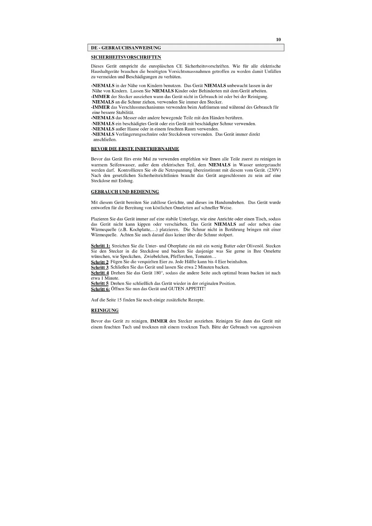 Mit thisem Gerät bereiten Sie zahllosse Gerichte, und these im Handumdrehen. Das Gerät wurde entworfen für die Bereitung von kõstlichen Omeletten auf Schneller Weise.