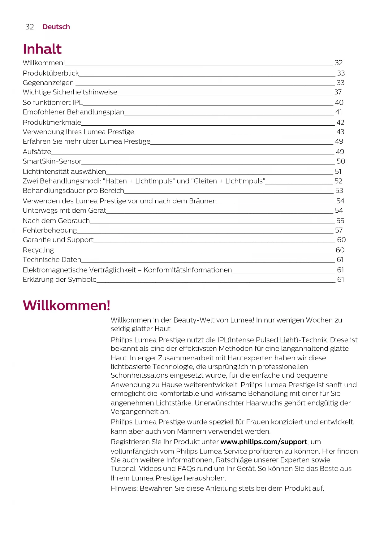 Deutsch Inhalt Willkommen!___________________________________________________________________________________________ 32 Produktüberblick_______________________________________________________________________________________ 33 Gegenanzeigen ________________________________________________________________________________________ 33 Wichtige Sicherheitshinweise_________________________________________________________________________ 37 So funktioniert IPL_____________________________________________________________________________________ 40 Empfohlener Behandlungsplan_______________________________________________________________________ 41 Produktmerkmale______________________________________________________________________________________ 42 Verwendung Ihres Lumea Prestige____________________________________________________________________ 43 Erfahren Sie mehr über Lumea Prestige______________________________________________________________ 49 Aufsätze________________________________________________________________________________________________ 49 SmartSkin-Sensor______________________________________________________________________________________ 50 Lichtintensität auswählen_____________________________________________________________________________ 51 Zwei Behandlungsmodi: "Halten + Lichtimpuls" und "Gleiten + Lichtimpuls"_______________________ 52 Behandlungsdauer pro Bereich_______________________________________________________________________ 53 Verwenden des Lumea Prestige vor und nach dem Bräunen________________________________________ 54 Unterwegs mit dem Gerät_____________________________________________________________________________ 54 Nach dem Gebrauch___________________________________________________________________________________ 55 Fehlerbehebung_______________________________________________________________________________________ 57 Garantie und Support__________________________________________________________________________________ 60 Recycling_______________________________________________________________________________________________ 60 Technische Daten______________________________________________________________________________________ 61 Elektromagnetische Verträglichkeit – Konformitätsinformationen___________________________________ 61 Erklärung der Symbole_________________________________________________________________________________ 61 Willkommen! Willkommen in der Beauty-Welt von Lumea! In nur wenigen Wochen zu seidig glatter Haut. Philips Lumea Prestige nutzt die IPL(Intense Pulsed Light)-Technik. Diese ist bekannt als eine der effektivsten Methoden für eine langanhaltend glatte Haut. In enger Zusammenarbeit mit Hautexperten haben wir diese lichtbasierte Technologie, die ursprünglich in professionellen Schönheitssalons eingesetzt wurde, für die einfache und bequeme Anwendung zu Hause weiterentwickelt. Philips Lumea Prestige ist sanft und ermöglicht die komfortable und wirksame Behandlung mit einer für Sie angenehmen Lichtstärke. Unerwünschter Haarwuchs gehört endgültig der Vergangenheit an. Philips Lumea Prestige wurde speziell für Frauen konzipiert und entwickelt, kann aber auch von Männern verwendet werden. Registrieren Sie Ihr Produkt unter www.philips.com/support, um vollumfänglich vom Philips Lumea Service profitieren zu können. Hier finden Sie auch weitere Informationen, Ratschläge unserer Experten sowie Tutorial-Videos und FAQs rund um Ihr Gerät. So können Sie das Beste aus Ihrem Lumea Prestige herausholen. Hinweis: Bewahren Sie diese Anleitung stets bei dem Produkt auf.33 Deutsch