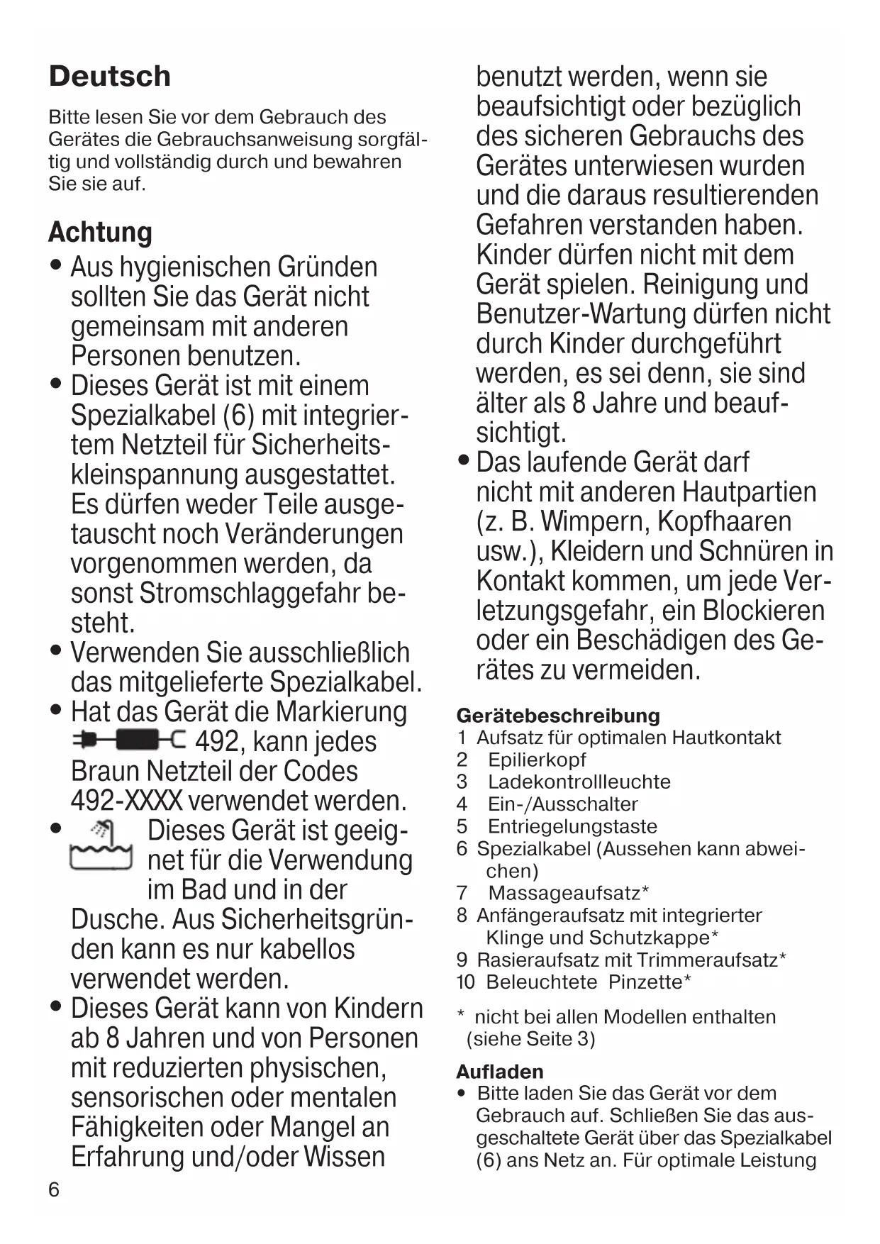 Das laufende Gerät darf nicht mit anderen Hautpartien (z. B. Wimpern, Kopfhaaren usw.), Kleidern und Schnüren in Kontakt kommen, um jede Ver- letzungsgefahr, ein Blockieren oder ein Beschädigen des Ge- rätes zu vermeiden. Gerätebeschreibung 1 Aufsatz für optimalen Hautkontakt 2 Epilierkopf 3 Ladekontrollleuchte 4 Ein-/Ausschalter 5 Entriegelungstaste 6 Spezialkabel (Aussehen kann abwei- chen) 7 Massageaufsatz* 8 Anfängeraufsatz mit integrierter Klinge und Schutzkappe* 9 Rasieraufsatz mit Trimmeraufsatz* 0 Beleuchtete Pinzette*