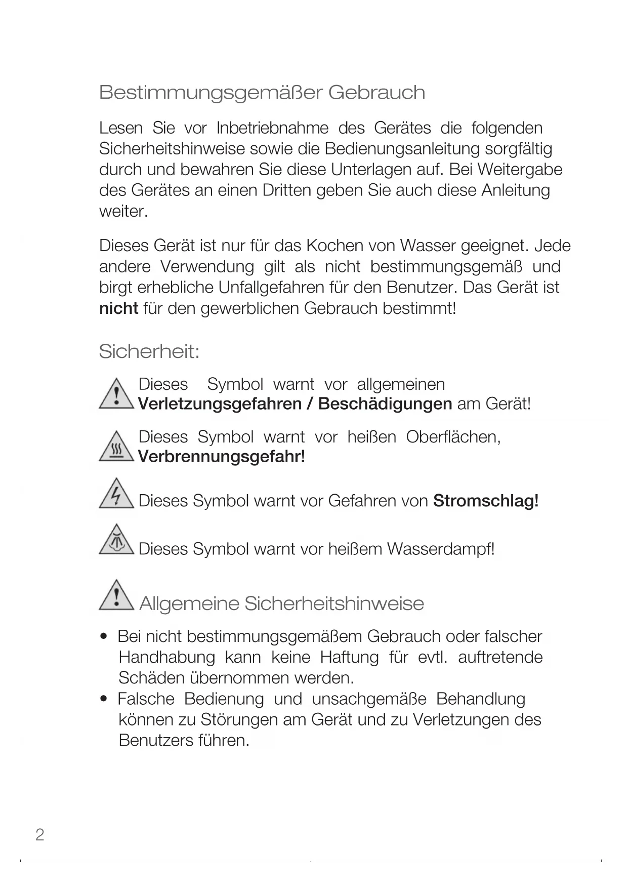 Bestimmungsgemäßer Gebrauch Lesen Sie vor Inbetriebnahme des Gerätes die folgenden Sicherheitshinweise sowie die Bedienungsanleitung sorgfältig durch und bewahren Sie diese Unterlagen auf. Bei Weitergabe des Gerätes an einen Dritten geben Sie auch diese Anleitung weiter. Dieses Gerät ist nur für das Kochen von Wasser geeignet. Jede andere Verwendung gilt als nicht bestimmungsgemäß und birgt erhebliche Unfallgefahren für den Benutzer. Das Gerät ist nicht für den gewerblichen Gebrauch bestimmt! Sicherheit: Dieses Symbol warnt vor allgemeinen Verletzungsgefahren / Beschädigungen am Gerät! Dieses Symbol warnt vor heißen Oberflächen, Verbrennungsgefahr! Dieses Symbol warnt vor Gefahren von Stromschlag! Dieses Symbol warnt vor heißem Wasserdampf! Allgemeine Sicherheitshinweise