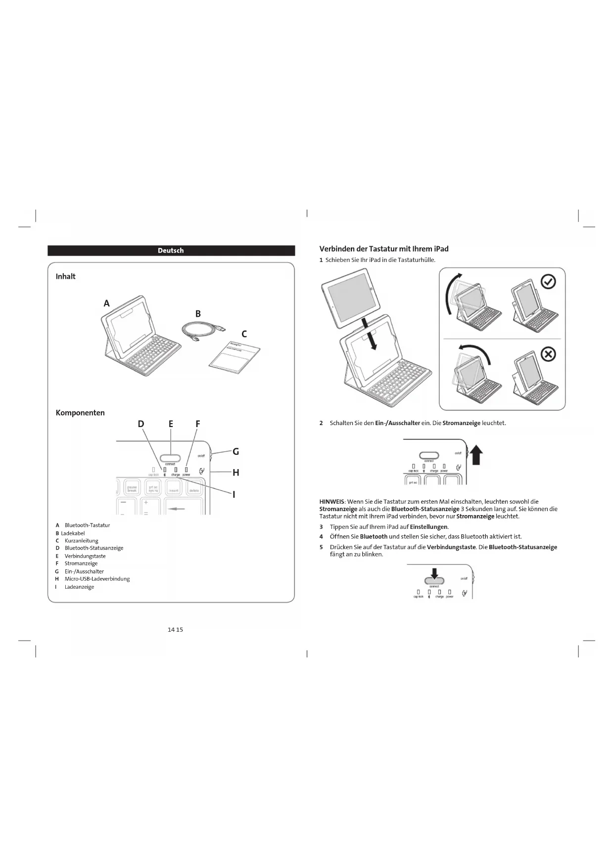 - Wenn das KeyFolio beginnnt, Wölungen zu zeigen oder sich ausdehn, einen starken Geruch ausstrommt oder sich heil affuhl, sollen den Sie das KeyFolio nicht mehr verwenden und Produkte von einem qualifizierten Elektrotechniker untersuchen lassen, bevor Sie es wieder in Betrieb fühmen.