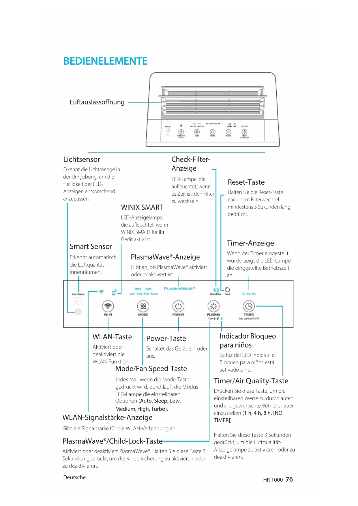 Deutsche HR 1000 Lichtsensor Erkennt die Lichtmenge in der Umgebung, um die Helligkeit der LED- Anzeigen entsprechend anzupassen. Timer-Anzeige Wenn der Timer eingestellt wurde, zeigt die LED-Lampe die eingestellte Betriebszeit an. PlasmaWave®-Anzeige Gibt an, ob PlasmaWave® aktiviert oder deaktiviert ist Smart Sensor Erkennt automatisch die Luftqualität in Innenräumen. Indicador Bloqueo para niños La luz del LED indica si el Bloqueo para niños está activado o no. WLAN-Signalstärke-Anzeige Gibt die Signalstärke für die WLAN-Verbindung an. Mode/Fan Speed-Taste Jedes Mal, wenn die Mode-Taste gedrückt wird, durchläuft die Modus- LED-Lampe die einstellbaren Optionen (Auto, Sleep, Low, Medium, High, Turbo). Power-Taste Schaltet das Gerät ein oder aus. Timer/Air Quality-Taste Drücken Sie diese Taste, um die einstellbaren Werte zu durchlaufen und die gewünschte Betriebsdauer einzustellen (1 h, 4 h, 8 h, [NO TIMER]). Halten Sie diese Taste 3 Sekunden gedrückt, um die Luftqualität- Anzeigelampe zu aktivieren oder zu deaktivieren. PlasmaWave®/Child-Lock-Taste Aktiviert oder deaktiviert PlasmaWave®. Halten Sie diese Taste 3 Sekunden gedrückt, um die Kindersicherung zu aktivieren oder zu deaktivieren. Check-Filter- Anzeige LED-Lampe, die aufleuchtet, wenn es Zeit ist, den Filter zu wechseln. Reset-Taste Halten Sie die Reset-Taste nach dem Filterwechsel mindestens 5 Sekunden lang gedrückt. BEDIENELEMENTE WLAN-Taste Aktiviert oder deaktiviert die WLAN-Funktion. WINIX SMART LED-Anzeigelampe, die aufleuchtet, wenn WINIX SMART für Ihr Gerät aktiv ist. LuftauslassöffnungSetup | Installation Deutsche HR 1000 WARNHINWEIS Befolgen Sie diese Anweisungen, um das Risiko von schweren oder tödlichen Verletzungen und die Gefahr einer Beschädigung des Geräts zu verringern. AUFSTELLUNGSORT Verwenden Sie das Gerät nicht in der Nähe von Nebeln oder Dämpfen von industriellem Öl oder größeren Mengen an metallischen Staub.Installieren Sie das Gerät nicht in irgendeiner Art von Motor- oder Transportfahrzeug (LKW, Boote, Schiffe usw.)Stellen Sie das Gerät nicht in der Nähe von brennbaren Materialien (Aerosole, Brennstoffe, Gase usw.) auf.Stellen Sie das Gerät nicht unterhalb einer elektrischen Steckdose auf.Stellen Sie das Gerät nicht in der Nähe von Heizelementen auf.Stellen Sie das Gerät nicht in einem Bereich mit übermäßigen Mengen an giftigen Gasen auf.Achten Sie darauf, dass das Gerät nicht in den Wind oder in Zugluft gerichtet ist.Stellen Sie das Gerät nicht in übermäßig feuchten Bereichen auf, wo es nass werden könnte.Achten Sie darauf, dass der Luftreiniger 30 bis 46 cm Abstand zu Fernsehgeräten, Rundfunkgeräten und anderen elektronischen Geräte hatStellen Sie das Gerät in Innenräumen geschützt vor direktem Sonnenlicht aufDirekte Sonneneinstrahlung kann Fehlfunktion oder einen Ausfall des Produkts zur Folge haben.Stellen Sie das Gerät auf einem harten und ebenen Untergrund aufInstabile oder geneigte Flächen können zu ungewöhnlichen Geräuschen und Vibrationen führen. Dieses Gerät ist nicht dafür vorgesehen, zur Erhaltung von Dokumenten oder zur Konservierung von Kunstwerken verwendet zu werden. Elektromagnetische Störungen von bestimmten Elektronikelementen können sonst Fehlfunktionen verursachen. 30~46 cm 10 cm78 Installation | Setup Deutsche HR 1000