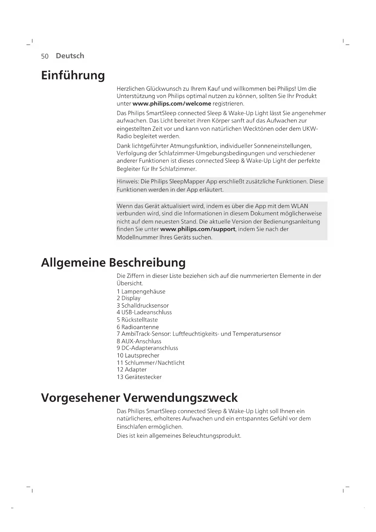 Deutsch Inhalt Einführung _______________________________________________________________________________ 50 Allgemeine Beschreibung __________________________________________________________________ 50 Vorgesehener Verwendungszweck __________________________________________________________ 50 Die Wirkung des Sleep & Wake-Up Light _____________________________________________________ 51 Wichtige Sicherheitsinformationen __________________________________________________________ 51 Sicherheit und Einhaltung von Normen ______________________________________________________ 53 Elektromagnetische Felder (EMF) ____________________________________________________________ 53 Interaktive Menüsymbole __________________________________________________________________ 53 WLAN-Verbindung des Geräts ______________________________________________________________ 54 Navigation durch das Menü ________________________________________________________________ 56 Einstellung der Weckprofile_________________________________________________________________ 56 Uhrzeit + Wecker Backup___________________________________________________________________ 58 Schlummerfunktion _______________________________________________________________________ 58 Wecksignal ausschalten ____________________________________________________________________ 58 Verwenden des Geräts als Nachttischlampe___________________________________________________ 58 Nachtlicht ________________________________________________________________________________ 59 Einstellungen _____________________________________________________________________________ 59 Musik hören ______________________________________________________________________________ 61 Entspannungsprogramme__________________________________________________________________ 62 Sonnenuntergangssimulation_______________________________________________________________ 62 RelaxBreathe _____________________________________________________________________________ 63 Einschlaffunktion__________________________________________________________________________ 64 Mobiltelefon aufladen _____________________________________________________________________ 64 Reinigung und Aufbewahrung ______________________________________________________________ 65 Recycling_________________________________________________________________________________ 65 Garantie und Support______________________________________________________________________ 65 Fehlerbehebung __________________________________________________________________________ 65 Technische Daten _________________________________________________________________________ 69 Open-Source- und Drittanbietersoftware _____________________________________________________ 7150 Deutsch Einführung Herzlichen Glückwunsch zu Ihrem Kauf und willkommen bei Philips! Um die Unterstützung von Philips optimal nutzen zu können, sollten Sie Ihr Produkt unter www.philips.com/welcome registrieren. Das Philips SmartSleep connected Sleep & Wake-Up Light lässt Sie angenehmer aufwachen. Das Licht bereitet ihren Körper sanft auf das Aufwachen zur eingestellten Zeit vor und kann von natürlichen Wecktönen oder dem UKW- Radio begleitet werden. Dank lichtgeführter Atmungsfunktion, individueller Sonneneinstellungen, Verfolgung der Schlafzimmer-Umgebungsbedingungen und verschiedener anderer Funktionen ist dieses connected Sleep & Wake-Up Light der perfekte Begleiter für Ihr Schlafzimmer. Hinweis: Die Philips SleepMapper App erschließt zusätzliche Funktionen. Diese Funktionen werden in der App erläutert. Wenn das Gerät aktualisiert wird, indem es über die App mit dem WLAN verbunden wird, sind die Informationen in diesem Dokument möglicherweise nicht auf dem neuesten Stand. Die aktuelle Version der Bedienungsanleitung finden Sie unter www.philips.com/support, indem Sie nach der Modellnummer Ihres Geräts suchen. Allgemeine Beschreibung Die Ziffern in dieser Liste beziehen sich auf die nummerierten Elemente in der Übersicht. 1 Lampengehäuse 2 Display 3 Schalldrucksensor 4 USB-Ladeanschluss 5 Rückstelltaste 6 Radioantenne 7 AmbiTrack-Sensor: Luftfeuchtigkeits- und Temperatursensor 8 AUX-Anschluss 9 DC-Adapteranschluss 10 Lautsprecher 11 Schlummer/Nachtlicht 12 Adapter 13 Gerätestecker Vorgesehener Verwendungszweck Das Philips SmartSleep connected Sleep & Wake-Up Light soll Ihnen ein natürlicheres, erholteres Aufwachen und ein entspanntes Gefühl vor dem Einschlafen ermöglichen. Dies ist kein allgemeines Beleuchtungsprodukt.51 Deutsch Die Wirkung des Sleep & Wake-Up Light Das Philips SmartSleep connected Sleep & Wake-Up Light bereitet Ihren Körper in den letzten 30Minuten des Schlafs sanft auf das Aufwachen vor. In den frühen Morgenstunden sind unsere Augen lichtempfindlicher als während der Wachphasen am Tag. In dieser Phase bereitet sich der Körper dank der relativ geringen Lichtintensität eines simulierten Sonnenaufgangs auf das Aufwachen und Munterwerden vor. Durch die Anwendung des Geräts werden Sie leichter wach und fühlen sich morgens wohler und energiegeladener. Da die Lichtempfindlichkeit bei jedem Menschen unterschiedlich ist, können Sie die Lichtintensität Ihres Geräts so einstellen, dass sie Ihrer Lichtempfindlichkeit für einen optimalen Start in den Tag am besten entspricht. Um die Wirkung des connected Sleep & Wake-Up Light voll und ganz zu erleben, stellen Sie das Gerät etwa 40 – 50cm von Ihrem Kopf entfernt auf einer ebenen, stabilen Fläche Ihres Nachttischs auf. Weitere Informationen zum connected Sleep & Wake-Up Light finden Sie unter www.philips.com. Wichtige Sicherheitsinformationen Lesen Sie diese wichtigen Informationen vor dem Gebrauch des Geräts aufmerksam durch und bewahren Sie sie für eine spätere Verwendung auf. Gefahr