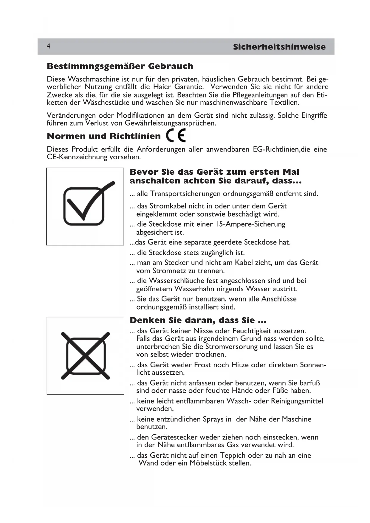 Bestimmngsgemäßer Gebrauch Diese Waschmaschine ist nur für den privaten, häuslichen Gebrauch bestimmt. Bei ge- werblicher Nutzung entfällt die Haier Garantie. Verwenden Sie sie nicht für andere Zwecke als die, für die sie ausgelegt ist. Beachten Sie die Pflegeanleitungen auf den Eti- ketten der Wäschestücke und waschen Sie nur maschinenwaschbare Textilien. Veränderungen oder Modifikationen an dem Gerät sind nicht zulässig. Solche Eingriffe führen zum Verlust von Gewährleistungsansprüchen. Normen und Richtlinien Dieses Produkt erfüllt die Anforderungen aller anwendbaren EG-Richtlinien,die eine CE-Kennzeichnung vorsehen.Sicherheitshinweise Im täglichen Gebrauch achten Sie darauf, dass … ... Reißverschlüsse geschlossen sind und lose Teile fixiert werden, damit die Wäsche keinen Schaden nimmt. Falls nötig, verwenden Sie ein Wäschenetz. ... Sie das Gerät nach jedem Waschgang ausschalten und den Netzstecker ziehen. Dies dient sowohl Ihrer Sicherheit als auch der Senkung Ihres Energie-Verbrauchs. ... Sie den unteren Teil der Tür sauber und trocken halten und die Tür bei Nichtbenutzung leicht geöffnet lassen, damit sich keine unangenehmen Gerüche bilden. ... ein beschädigtes Stromkabel nur vom Hersteller, dem Kun- dendienst oder einem entsprechenden Fachmann ersetzt wird. Denken Sie daran, dass Sie ... ... das Gerät nicht abdecken oder zustellen. Im Betrieb ent- stehende Feuchtigkeit muss abtrocknen können! ... keine schweren, heißen oder feuchten Gegenstände oder Hitzequellen auf das Gerät stellen. ... Schwämme oder Ähnliches nicht zu heiß waschen. ... nicht die Waschmittelschublade öffnen, während der Waschvorgang läuft. ... nicht die Tür anfassen, solange der Waschvorgang läuft. Die Tür wird heiß! ... nicht die Tür öffnen, solange der Wasserstand sichtbar oberhalb der Türöffnung steht. ... die Tür des Geräts nicht mit Gewalt öffnen. Ein Sicher- heitsmechanismus gibt die Tür erst eine gewisse Zeit nach Beendigung des Waschvorgangs frei.