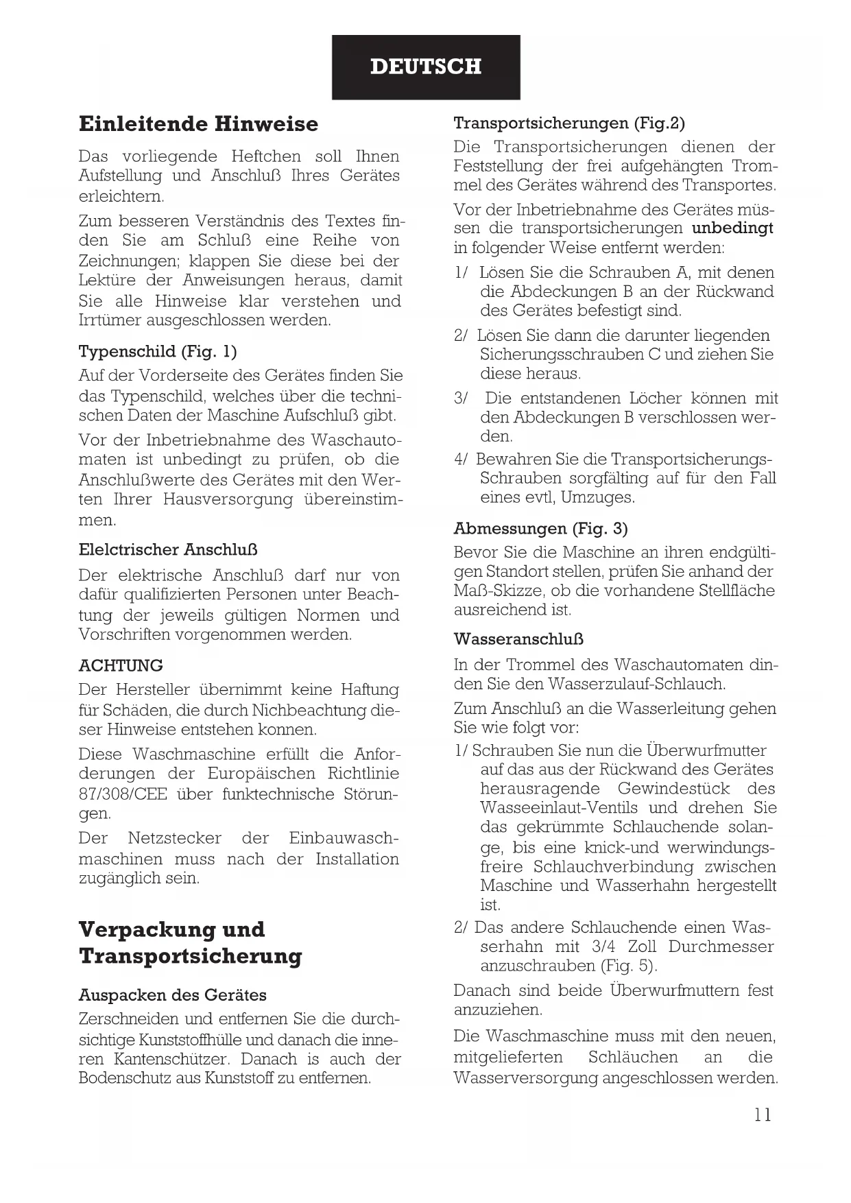 ENGLISHEinleitende Hinweise Das vorliegende Heftchen soll Ihnen Aufstellung und Anschluß Ihres Gerätes erleichtern. Zum besseren Verständnis des Textes fin- den Sie am Schluß eine Reihe von Zeichnungen; klappen Sie diese bei der Lektüre der Anweisungen heraus, damit Sie alle Hinweise klar verstehen und Irrtümer ausgeschlossen werden. Typenschild (Fig. 1) Auf der Vorderseite des Gerätes finden Sie das Typenschild, welches über die techni- schen Daten der Maschine Aufschluß gibt. Vor der Inbetriebnahme des Waschauto- maten ist unbedingt zu prüfen, ob die Anschlußwerte des Gerätes mit den Wer- ten Ihrer Hausversorgung übereinstim- men. Elelctrischer Anschluß Der elektrische Anschluß darf nur von dafür qualifizierten Personen unter Beach- tung der jeweils gültigen Normen und Vorschriften vorgenommen werden. ACHTUNG Der Hersteller übernimmt keine Haftung für Schäden, die durch Nichbeachtung die- ser Hinweise entstehen konnen. Diese Waschmaschine erfüllt die Anfor- derungen der Europäischen Richtlinie 87/308/CEE über funktechnische Störun- gen. Der Netzstecker der Einbauwasch- maschinen muss nach der Installation zugänglich sein. Verpackung und Transportsicherung Auspacken des Gerätes Zerschneiden und entfernen Sie die durch- sichtige Kunststoffhülle und danach die inne- ren Kantenschützer. Danach is auch der Bodenschutz aus Kunststoff zu entfernen. Transportsicherungen (Fig.2) Die Transportsicherungen dienen der Feststellung der frei aufgehängten Trom- mel des Gerätes während des Transportes. Vor der Inbetriebnahme des Gerätes müs- sen die transportsicherungen unbedingt in folgender Weise entfernt werden: 1/ Lösen Sie die Schrauben A, mit denen die Abdeckungen B an der Rückwand des Gerätes befestigt sind. 2/ Lösen Sie dann die darunter liegenden Sicherungsschrauben C und ziehen Sie diese heraus. 3/ Die entstandenen Löcher können mit den Abdeckungen B verschlossen wer- den. 4/ Bewahren Sie die Transportsicherungs- Schrauben sorgfälting auf für den Fall eines evtl, Umzuges. Abmessungen (Fig. 3) Bevor Sie die Maschine an ihren endgülti- gen Standort stellen, prüfen Sie anhand der Maß-Skizze, ob die vorhandene Stellfläche ausreichend ist. Wasseranschluß In der Trommel des Waschautomaten din- den Sie den Wasserzulauf-Schlauch. Zum Anschluß an die Wasserleitung gehen Sie wie folgt vor: 1/ Schrauben Sie nun die Überwurfmutter auf das aus der Rückwand des Gerätes herausragende Gewindestück des Wasseeinlaut-Ventils und drehen Sie das gekrümmte Schlauchende solan- ge, bis eine knick-und werwindungs- freire Schlauchverbindung zwischen Maschine und Wasserhahn hergestellt ist. 2/ Das andere Schlauchende einen Was- serhahn mit 3/4 Zoll Durchmesser anzuschrauben (Fig. 5). Danach sind beide Überwurfmuttern fest anzuziehen. Die Waschmaschine muss mit den neuen, mitgelieferten Schläuchen an die Wasserversorgung angeschlossen werden.