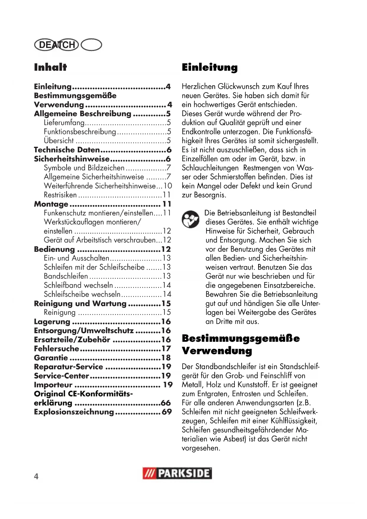 - Explosionszeichnung Einleitung Herzlichen Glückwunsch zum Kauf Ihres neuen Gerätes. Sie haben sich damit für ein hochwertiges Gerät entschieden. Dieses Gerät wurde während der Pro- duktion auf Qualität geprüft und einer Endkontrolle unterzogen. Die Funktionsfä- higkeit Ihres Gerätes ist somit sichergestellt. Es ist nicht auszuschließen, dass sich in Einzelfällen am oder im Gerät, bzw. in Schlauchleitungen Restmengen von Was- ser oder Schmierstoffen benden. Dies ist kein Mangel oder Defekt und kein Grund zur Besorgnis. Die Betriebsanleitung ist Bestandteil dieses Gerätes. Sie enthält wichtige Hinweise für Sicherheit, Gebrauch und Entsorgung. Machen Sie sich vor der Benutzung des Gerätes mit allen Bedien- und Sicherheitshin- weisen vertraut. Benutzen Sie das Gerät nur wie beschrieben und für die angegebenen Einsatzbereiche. Bewahren Sie die Betriebsanleitung gut auf und händigen Sie alle Unter- lagen bei Weitergabe des Gerätes an Dritte mit aus. Bestimmungsgemäße Verwendung Der Standbandschleifer ist ein Standschleif- gerät für den Grob- und Feinschliff von Metall, Holz und Kunststoff. Er ist geeignet zum Entgraten, Entrosten und Schleifen. Für alle anderen Anwendungsarten (z.B. Schleifen mit nicht geeigneten Schleifwerk- zeugen, Schleifen mit einer Kühlüssigkeit, Schleifen gesundheitsgefährdender Ma- terialien wie Asbest) ist das Gerät nicht vorgesehen.5 DE AT CH Das Gerät ist für den Einsatz im Heimwer- kerbereich bestimmt. Es wurde nicht für den gewerblichen Dauereinsatz konzipiert. Das Gerät ist zum Gebrauch durch Er- wachsene bestimmt. Jugendliche über 16Jahre dürfen das Gerät nur unter Auf- sicht benutzen. Der Hersteller haftet nicht für Schäden, die durch bestimmungswidrigen Gebrauch oder falsche Bedienung verursacht wurden. Allgemeine Beschreibung Die Abbildung der wichtigsten Funktionsteile nden Sie auf der vorderen und hinteren Aus- klappseite. Lieferumfang Packen Sie das Gerät aus und kontrollieren Sie, ob es vollständig ist. Entsorgen Sie das Verpackungsmaterial ordnungsgemäß. - Gerät - Transparenter Funkenschutz ( p. 69