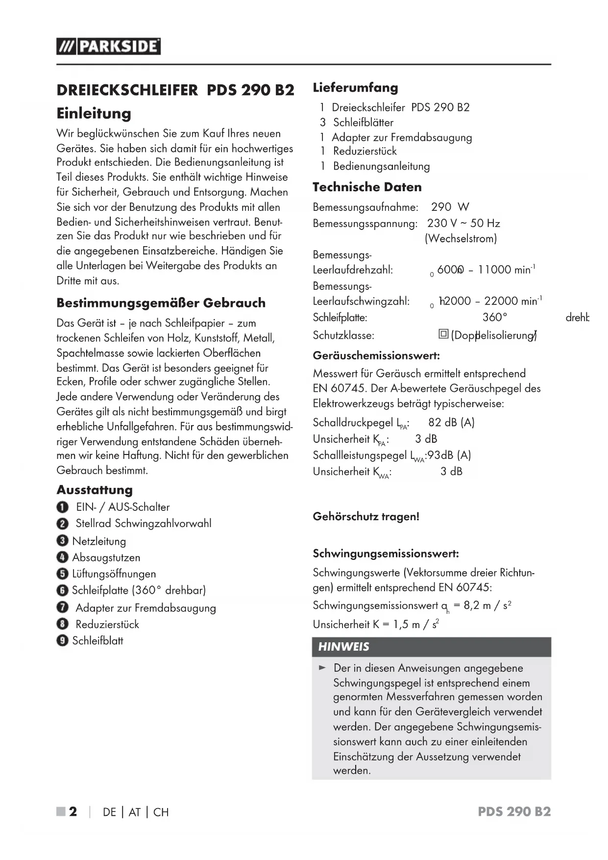 Einleitung Wir beglückwünschen Sie zum Kauf Ihres neuen Gerätes. Sie haben sich damit für ein hochwertiges Produkt entschieden. Die Bedienungsanleitung ist Teil dieses Produkts. Sie enthält wichtige Hinweise für Sicherheit, Gebrauch und Entsorgung. Machen Sie sich vor der Benutzung des Produkts mit allen Bedien- und Sicherheitshinweisen vertraut. Benut- zen Sie das Produkt nur wie beschrieben und für die angegebenen Einsatzbereiche. Händigen Sie alle Unterlagen bei Weitergabe des Produkts an Dritte mit aus. Bestimmungsgemäßer Gebrauch Das Gerät ist – je nach Schleifpapier – zum trockenen Schleifen von Holz, Kunststoff, Metall, Spachtelmasse sowie lackierten Oberflächen bestimmt. Das Gerät ist besonders geeignet für Ecken, Profile oder schwer zugängliche Stellen. Jede andere Verwendung oder Veränderung des Gerätes gilt als nicht bestimmungsgemäß und birgt erhebliche Unfallgefahren. Für aus bestimmungswid- riger Verwendung entstandene Schäden überneh- men wir keine Haftung. Nicht für den gewerblichen Gebrauch bestimmt. Ausstattung EIN- / AUS-Schalter Stellrad Schwingzahlvorwahl Netzleitung Absaugstutzen Lüftungsöffnungen Schleifplatte (360° drehbar) Adapter zur Fremdabsaugung Reduzierstück Schleifblatt Lieferumfang 1 Dreieckschleifer PDS 290 B2 3 Schleifblätter 1 Adapter zur Fremdabsaugung 1 Reduzierstück 1 Bedienungsanleitung Technische Daten Bemessungsaufnahme: 290 W Bemessungsspannung: 230 V ∼ 50 Hz (Wechselstrom) Bemessungs- Leerlaufdrehzahl: n