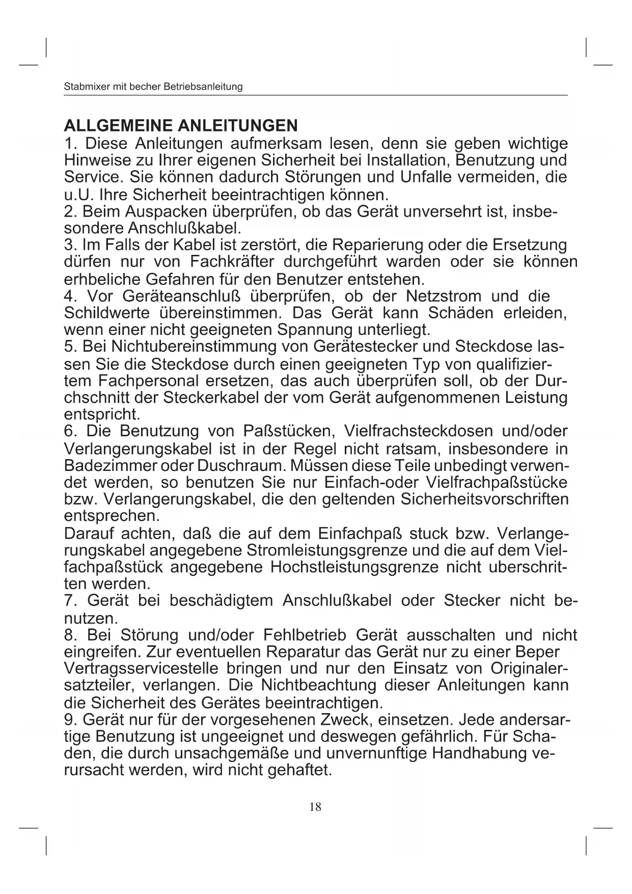 - Bei Störung und/oder Fehlbetrieb Gerät ausschalten und nicht eingreifen. Zur eventuellen Reparatur das Gerät nur zu einer Beper Vertragsservicestelle bringen und nur den Einsatz von Originalersatzteiler, verlangen. Die Nichtbeachtung dieser Anleitungen kann die Sicherheit des Gerätes beeintrachtigen.