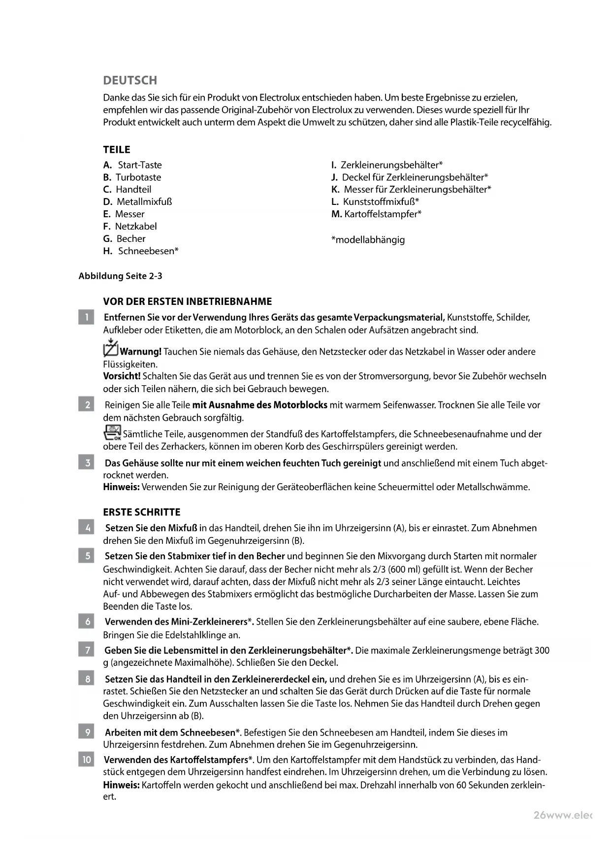 1 Entfernen Sie vor der Verwendung Ihres Geräts das gesamte Verpackungsmaterial, Kunststoe, Schilder, Aufkleber oder Etiketten, die am Motorblock, an den Schalen oder Aufsätzen angebracht sind. Warnung! Tauchen Sie niemals das Gehäuse, den Netzstecker oder das Netzkabel in Wasser oder andere Flüssigkeiten. Vorsicht! Schalten Sie das Gerät aus und trennen Sie es von der Stromversorgung, bevor Sie Zubehör wechseln oder sich Teilen nähern, die sich bei Gebrauch bewegen. 2 Reinigen Sie alle Teile mit Ausnahme des Motorblocks mit warmem Seifenwasser. Trocknen Sie alle Teile vor dem nächsten Gebrauch sorgfältig. Sämtliche Teile, ausgenommen der Standfuß des Kartoelstampfers, die Schneebesenaufnahme und der obere Teil des Zerhackers, können im oberen Korb des Geschirrspülers gereinigt werden. 3 Das Gehäuse sollte nur mit einem weichen feuchten Tuch gereinigt und anschließend mit einem Tuch abget- rocknet werden. Hinweis: Verwenden Sie zur Reinigung der Geräteoberächen keine Scheuermittel oder Metallschwämme. ERSTE SCHRITTE 4 Setzen Sie den Mixfuß in das Handteil, drehen Sie ihn im Uhrzeigersinn (A), bis er einrastet. Zum Abnehmen drehen Sie den Mixfuß im Gegenuhrzeigersinn (B). 5 Setzen Sie den Stabmixer tief in den Becher und beginnen Sie den Mixvorgang durch Starten mit normaler Geschwindigkeit. Achten Sie darauf, dass der Becher nicht mehr als 2/3 (600 ml) gefüllt ist. Wenn der Becher nicht verwendet wird, darauf achten, dass der Mixfuß nicht mehr als 2/3 seiner Länge eintaucht. Leichtes Auf- und Abbewegen des Stabmixers ermöglicht das bestmögliche Durcharbeiten der Masse. Lassen Sie zum Beenden die Taste los. 6 Verwenden des Mini-Zerkleinerers*. Stellen Sie den Zerkleinerungsbehälter auf eine saubere, ebene Fläche. Bringen Sie die Edelstahlklinge an. 7 Geben Sie die Lebensmittel in den Zerkleinerungsbehälter*. Die maximale Zerkleinerungsmenge beträgt 300 g (angezeichnete Maximalhöhe). Schließen Sie den Deckel. 8 Setzen Sie das Handteil in den Zerkleinererdeckel ein, und drehen Sie es im Uhrzeigersinn (A), bis es ein- rastet. Schießen Sie den Netzstecker an und schalten Sie das Gerät durch Drücken auf die Taste für normale Geschwindigkeit ein. Zum Ausschalten lassen Sie die Taste los. Nehmen Sie das Handteil durch Drehen gegen den Uhrzeigersinn ab (B). 9 Arbeiten mit dem Schneebesen*. Befestigen Sie den Schneebesen am Handteil, indem Sie dieses im Uhrzeigersinn festdrehen. Zum Abnehmen drehen Sie im Gegenuhrzeigersinn. 10 Verwenden des Kartoelstampfers*. Um den Kartoelstampfer mit dem Handstück zu verbinden, das Hand- stück entgegen dem Uhrzeigersinn handfest eindrehen. Im Uhrzeigersinn drehen, um die Verbindung zu lösen. Hinweis: Kartoeln werden gekocht und anschließend bei max. Drehzahl innerhalb von 60 Sekunden zerklein- ert.27www.electrolux.com