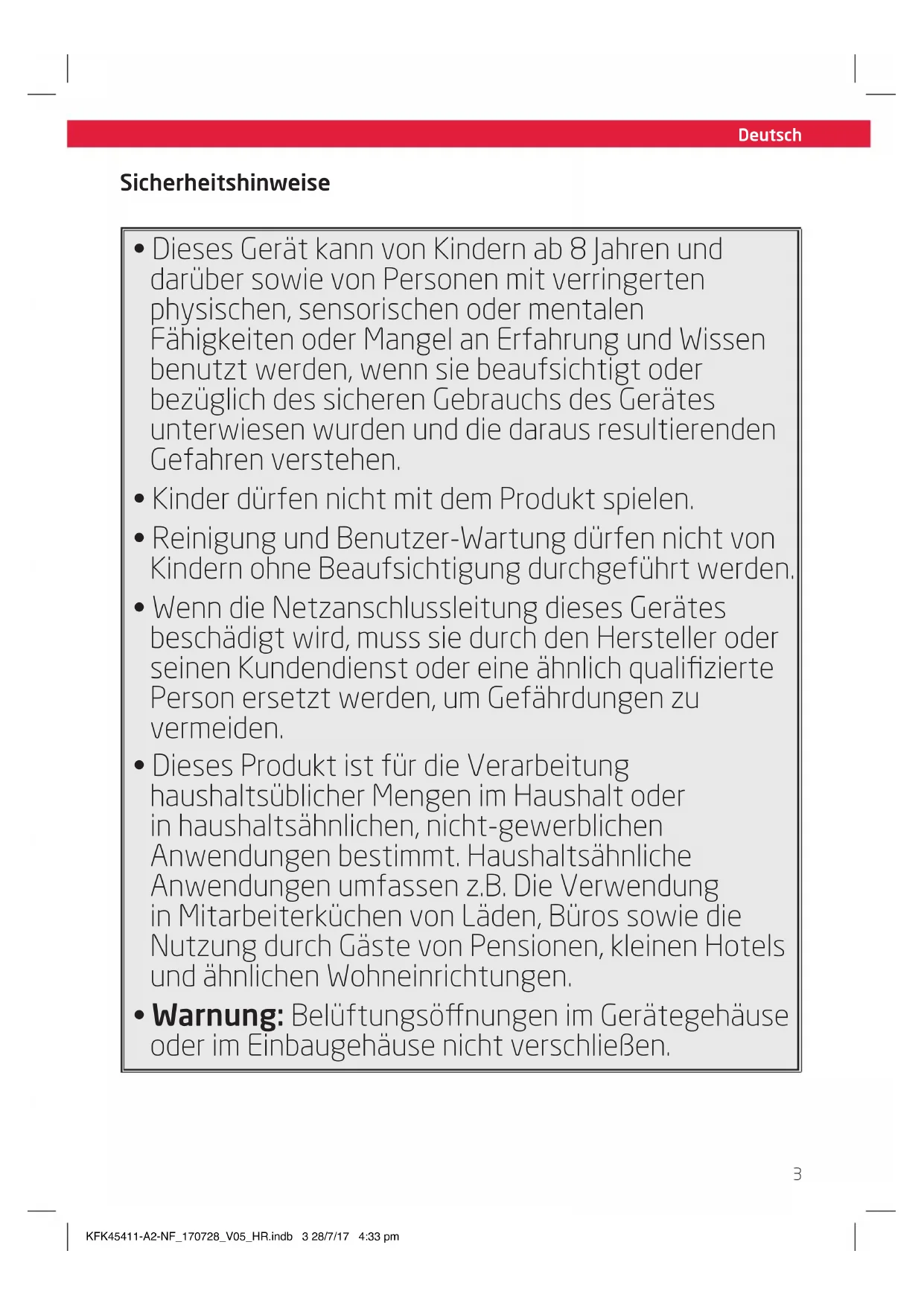 - Warnung: Belüftungsönungen im Gerätegehäuse oder im Einbaugehäuse nicht verschließen. KFK45411-A2-NF_170728_V05_HR.indb 3 28/7/17 4:33 pmDeutsch