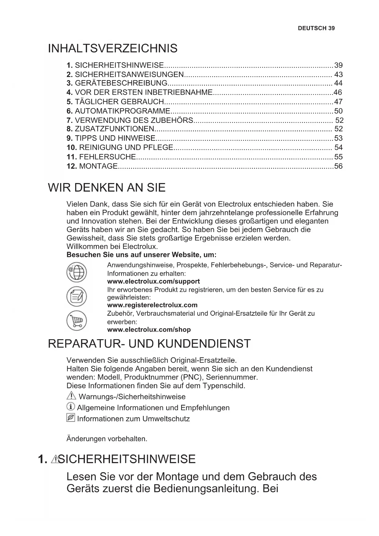 Vielen Dank, dass Sie sich für ein Gerät von Electrolux entschieden haben. Sie haben ein Produkt gewählt, hinter dem jahrzehntelange professionelle Erfahrung und Innovation stehen. Bei der Entwicklung dieses großartigen und eleganten Geräts haben wir an Sie gedacht. So haben Sie bei jedem Gebrauch die Gewissheit, dass Sie stets großartige Ergebnisse erzielen werden. Willkommen bei Electrolux. Besuchen Sie uns auf unserer Website, um: Anwendungshinweise, Prospekte, Fehlerbehebungs-, Service- und Reparatur- Informationen zu erhalten: www.electrolux.com/support Ihr erworbenes Produkt zu registrieren, um den besten Service für es zu gewährleisten: www.registerelectrolux.com Zubehör, Verbrauchsmaterial und Original-Ersatzteile für Ihr Gerät zu erwerben: www.electrolux.com/shop