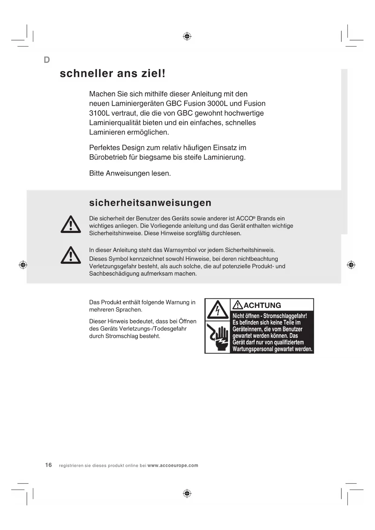 ACHTUNG: VOR DER REINIGUNG DER GERÄTEAUSSENSEITE MUSS DER NETZSTECKER GEZOGEN WERDEN. DAS GERÄT (NUR) AN DER AUSSENSEITE MIT EINEM FEUCHTEN TUCH ABWISCHEN. KEINE REINIGUNGS- ODER LÖSUNGSMITTEL VERWENDEN. Zum Reinigen der Walzen regelmäßig einen Reinigungskarton oder ein Blatt Papier durch das Laminiergerät laufen lassen. Bestellnr. für Reinigungskarton EK50000. gewährleistung Der Betrieb des Geräts ist bei normaler Verwendung für 2 Jahre ab Kaufdatum gewährleistet. Innerhalb des Gewährleistungszeitraums wird ACCO Brands Europe nach eigenem Ermessen das defekte Gerät entweder kostenlos instandsetzen oder ersetzen. Die Gewährleistung deckt keine Mängel ab, die aufgrund missbräuchlicher Verwendung oder Verwendung für unangemessene Zwecke entstanden sind. Ein Nachweis des Kaufdatums muss vorgelegt werden. Instandsetzungen oder Änderungen, die durch nicht von ACCO Brands Europe autorisierten Personen vorgenommen werden, setzen die Gewährleistung außer Kraft. Es ist unser Ziel, sicherzustellen, dass die Leistung unserer Produkte den angegebenen technischen Daten entspricht. Diese Gewährleistung stellt keine Einschränkung der nach dem geltenden Kaufvertragsrecht gültigen Rechte des Verbrauchers dar.I per una più veloce plastificazione dei documenti! Benvenuti alle nuove plasticatrici GBC Fusion 3000L e 3100L che consentono di plasticare documenti in maniera più semplice e veloce orendo la stessa elevata qualità di plasticazione che contraddistingue i prodotti GBC.Particolarmente adatte per un uso abbastanza frequente. Ideale per ottenere documenti da essibili a rigidi per l’ambiente oce.Si prega di leggere e osservare le istruzioni riportate di seguito quando si utilizza la plasticatrice.Pericolo di scarica elettrica. Non aprire. Non vi è alcun componente riparabile da parte dell’utente all’interno della macchina. Per operazioni di manutenzione o riparazione rivolgersi a personale qualicato. ATTENZIONE