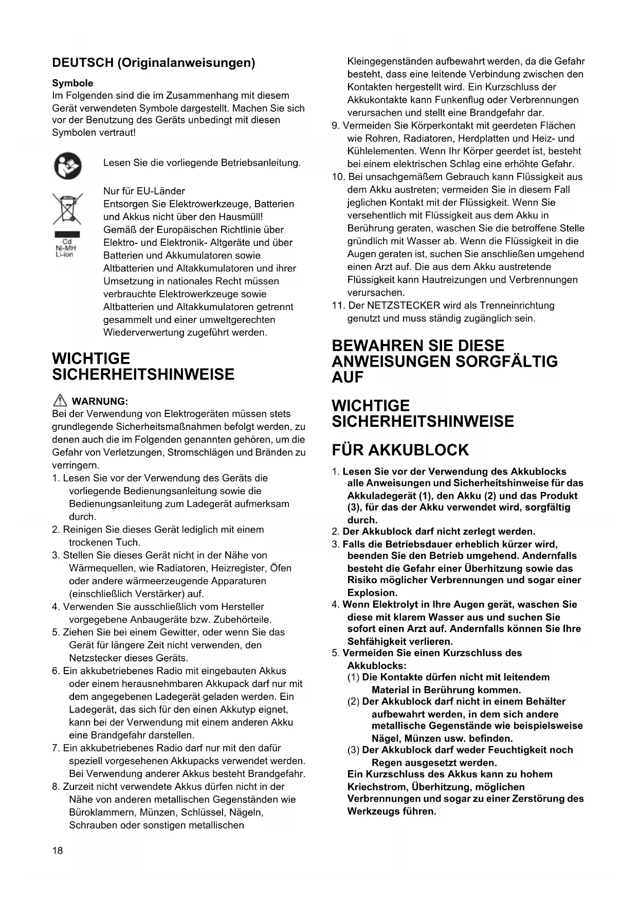 Akkublocks: (1) Die Kontakte dürfen nicht mit leitendem Material in Berührung kommen. (2) Der Akkublock darf nicht in einem Behälter aufbewahrt werden, in dem sich andere metallische Gegenstände wie beispielsweise Nägel, Münzen usw. befinden. (3) Der Akkublock darf weder Feuchtigkeit noch Regen ausgesetzt werden. Ein Kurzschluss des Akkus kann zu hohem Kriechstrom, Überhitzung, möglichen Verbrennungen und sogar zu einer Zerstörung des Werkzeugs führen. Lesen Sie die vorliegende Betriebsanleitung. Nur für EU-Länder Entsorgen Sie Elektrowerkzeuge, Batterien und Akkus nicht über den Hausmüll! Gemäß der Europäischen Richtlinie über Elektro- und Elektronik- Altgeräte und über Batterien und Akkumulatoren sowie Altbatterien und Altakkumulatoren und ihrer Umsetzung in nationales Recht müssen verbrauchte Elektrowerkzeuge sowie Altbatterien und Altakkumulatoren getrennt gesammelt und einer umweltgerechten Wiederverwertung zugeführt werden.19