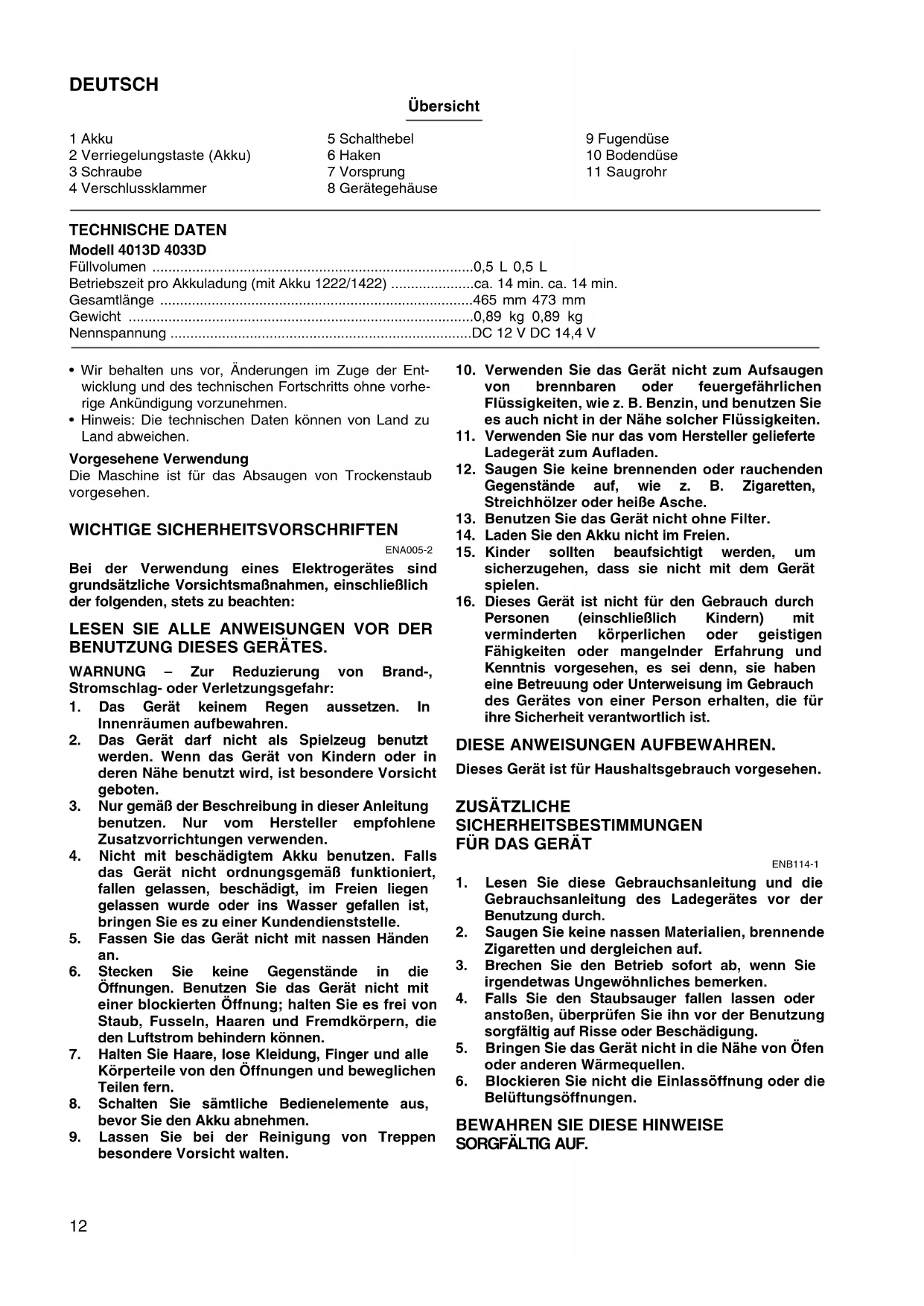- Hinweis: Die technischen Daten können von Land zu Land abweichen. Vorgesehene Verwendung Die Maschine ist für das Absaugen von Trockenstaub vorgesehen. WICHTIGE SICHERHEITSVORSCHRIFTEN ENA005-2 Bei der Verwendung eines Elektrogerätes sind grundsätzliche Vorsichtsmaßnahmen, einschließlich der folgenden, stets zu beachten: