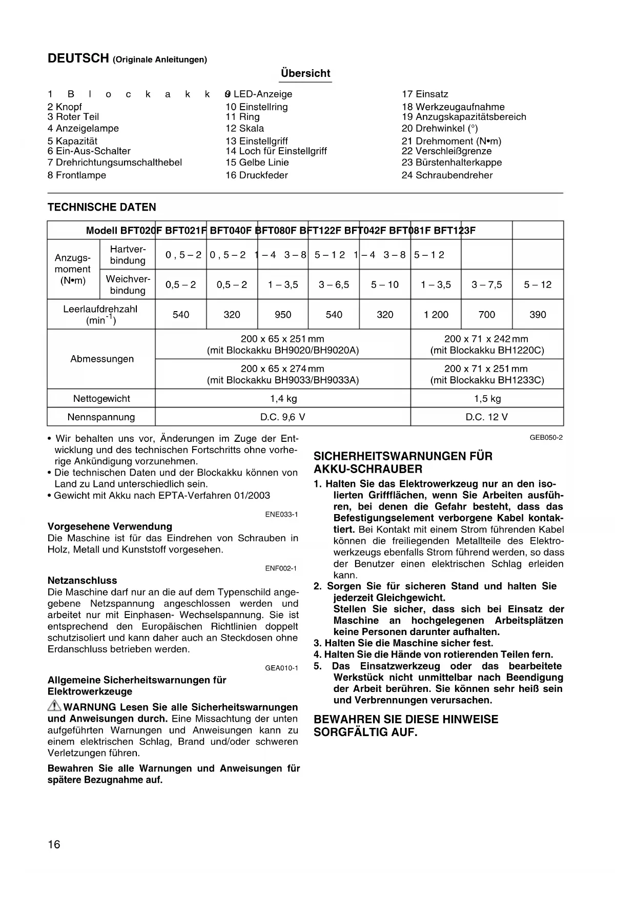 - Gewicht mit Akku nach EPTA-Verfahren 01/2003 ENE033-1 Vorgesehene Verwendung Die Maschine ist für das Eindrehen von Schrauben in Holz, Metall und Kunststoff vorgesehen. ENF002-1 Netzanschluss Die Maschine darf nur an die auf dem Typenschild ange- gebene Netzspannung angeschlossen werden und arbeitet nur mit Einphasen- Wechselspannung. Sie ist entsprechend den Europäischen Richtlinien doppelt schutzisoliert und kann daher auch an Steckdosen ohne Erdanschluss betrieben werden. GEA010-1 Allgemeine Sicherheitswarnungen für Elektrowerkzeuge WARNUNG Lesen Sie alle Sicherheitswarnungen und Anweisungen durch. Eine Missachtung der unten aufgeführten Warnungen und Anweisungen kann zu einem elektrischen Schlag, Brand und/oder schweren Verletzungen führen. Bewahren Sie alle Warnungen und Anweisungen für spätere Bezugnahme auf. GEB050-2