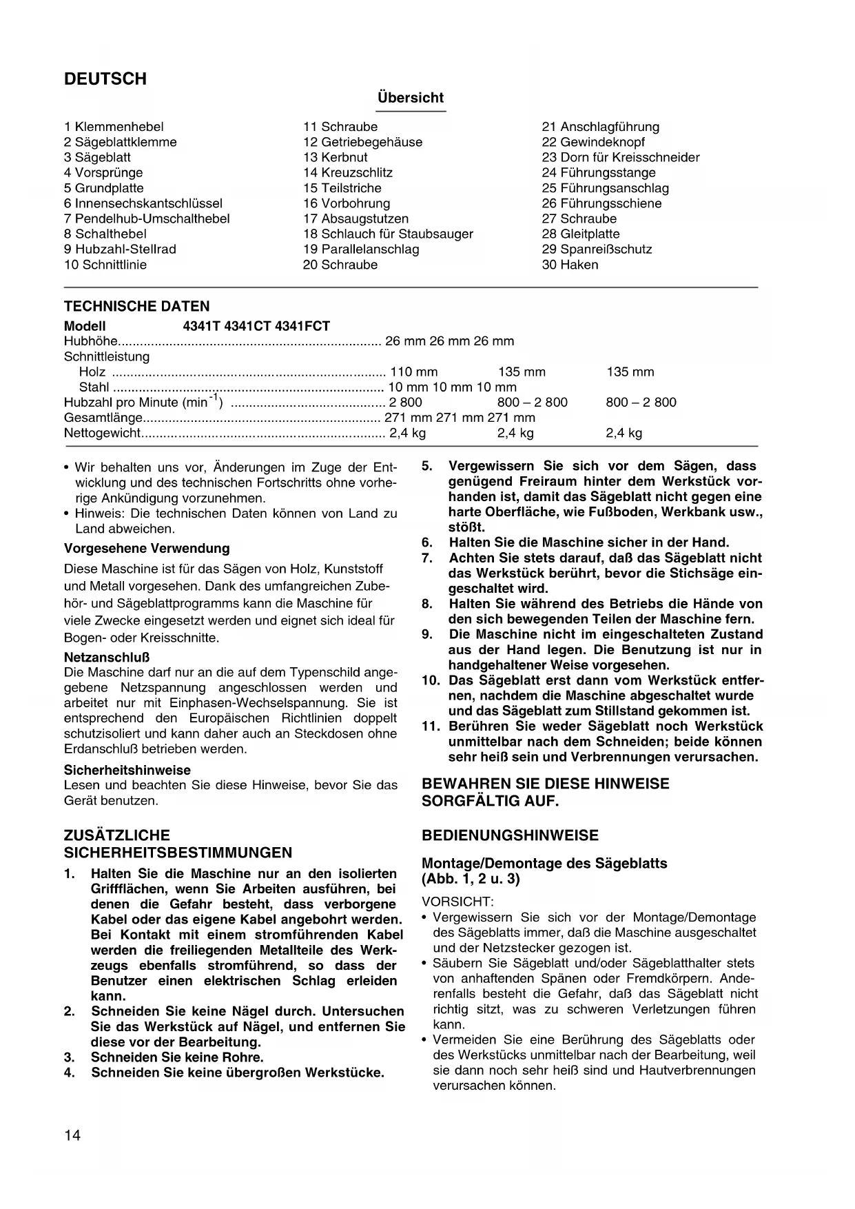 - Vergewissem Sie sich vor der Montage/Demontagedes Sägeblatts immer, daß die Maschine ausgescheltetund der Netzstecker gezogen ist.