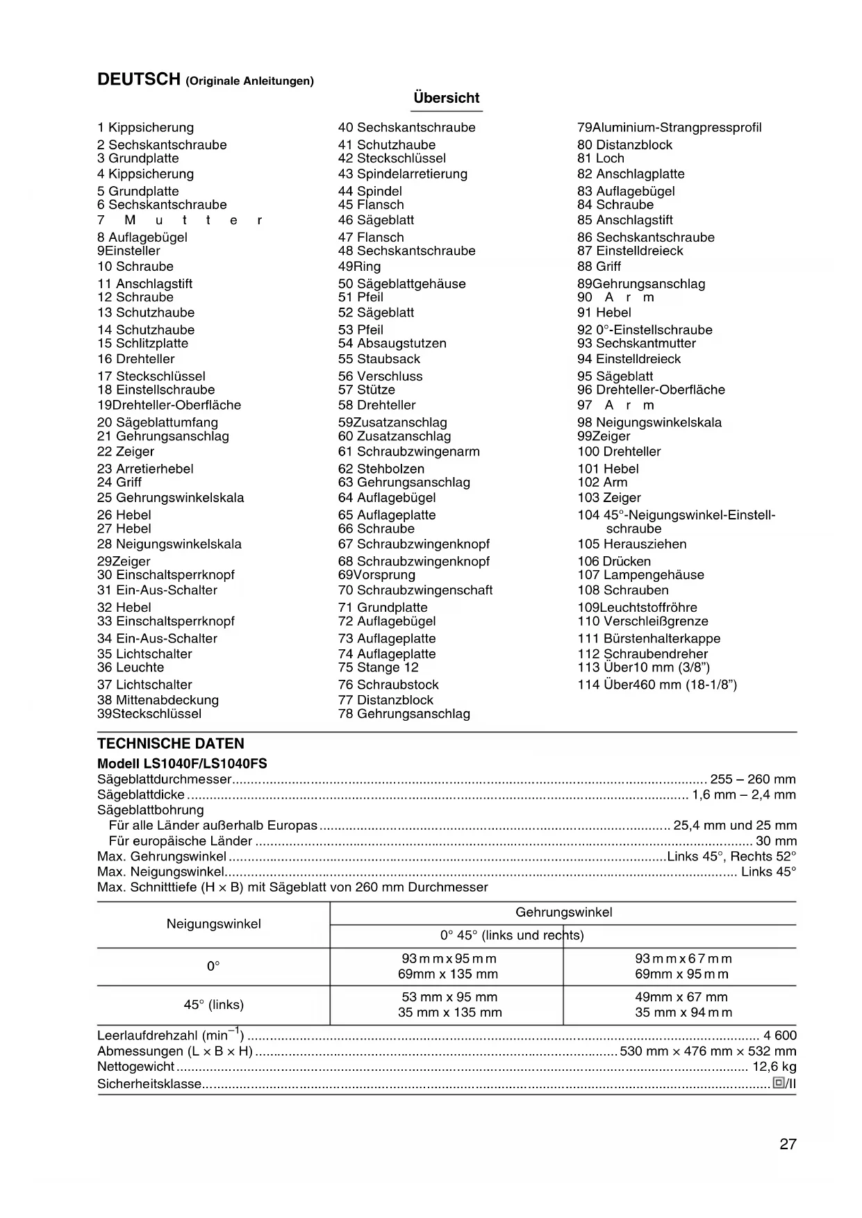 Yasushi Fukaya Directeur Makita, Jan-Baptist Vinkstraat 2, 3070, Belgique27 DEUTSCH (Originale Anleitungen) Übersicht 1 Kippsicherung 2 Sechskantschraube 3 Grundplatte 4 Kippsicherung 5 Grundplatte 6 Sechskantschraube 7Mutter 8 Auflagebügel 9 Einsteller 10 Schraube 11 Anschlagstift 12 Schraube 13 Schutzhaube 14 Schutzhaube 15 Schlitzplatte 16 Drehteller 17 Steckschlüssel 18 Einstellschraube 19 Drehteller-Oberfläche 20 Sägeblattumfang 21 Gehrungsanschlag 22 Zeiger 23 Arretierhebel 24 Griff 25 Gehrungswinkelskala 26 Hebel 27 Hebel 28 Neigungswinkelskala 29 Zeiger 30 Einschaltsperrknopf 31 Ein-Aus-Schalter 32 Hebel 33 Einschaltsperrknopf 34 Ein-Aus-Schalter 35 Lichtschalter 36 Leuchte 37 Lichtschalter 38 Mittenabdeckung 39 Steckschlüssel 40 Sechskantschraube 41 Schutzhaube 42 Steckschlüssel 43 Spindelarretierung 44 Spindel 45 Flansch 46 Sägeblatt 47 Flansch 48 Sechskantschraube 49 Ring 50 Sägeblattgehäuse 51 Pfeil 52 Sägeblatt 53 Pfeil 54 Absaugstutzen 55 Staubsack 56 Verschluss 57 Stütze 58 Drehteller 59 Zusatzanschlag 60 Zusatzanschlag 61 Schraubzwingenarm 62 Stehbolzen 63 Gehrungsanschlag 64 Auflagebügel 65 Auflageplatte 66 Schraube 67 Schraubzwingenknopf 68 Schraubzwingenknopf 69 Vorsprung 70 Schraubzwingenschaft 71 Grundplatte 72 Auflagebügel 73 Auflageplatte 74 Auflageplatte 75 Stange 12 76 Schraubstock 77 Distanzblock 78 Gehrungsanschlag 79 Aluminium-Strangpressprofil 80 Distanzblock 81 Loch 82 Anschlagplatte 83 Auflagebügel 84 Schraube 85 Anschlagstift 86 Sechskantschraube 87 Einstelldreieck 88 Griff 89 Gehrungsanschlag 90Arm 91 Hebel 92 0°-Einstellschraube 93 Sechskantmutter 94 Einstelldreieck 95 Sägeblatt 96 Drehteller-Oberfläche 97Arm 98 Neigungswinkelskala 99 Zeiger 100 Drehteller 101 Hebel 102 Arm 103 Zeiger 104 45°-Neigungswinkel-Einstell- schraube 105 Herausziehen 106 Drücken 107 Lampengehäuse 108 Schrauben 109 Leuchtstoffröhre 110 Verschleißgrenze 111 Bürstenhalterkappe 112 Schraubendreher 113 Über10 mm (3/8”) 114 Über460 mm (18-1/8”) TECHNISCHE DATEN Modell LS1040F/LS1040FS Sägeblattdurchmesser............................................................................................................................... 255 – 260 mm Sägeblattdicke ...................................................................................................................................... 1,6 mm – 2,4 mm Sägeblattbohrung Für alle Länder außerhalb Europas.............................................................................................. 25,4 mm und 25 mm Für europäische Länder ..................................................................................................................................... 30 mm Max. Gehrungswinkel.....................................................................................................................Links 45°, Rechts 52° Max. Neigungswinkel......................................................................................................................................... Links 45° Max. Schnitttiefe (H × B) mit Sägeblatt von 260 mm Durchmesser Leerlaufdrehzahl (min